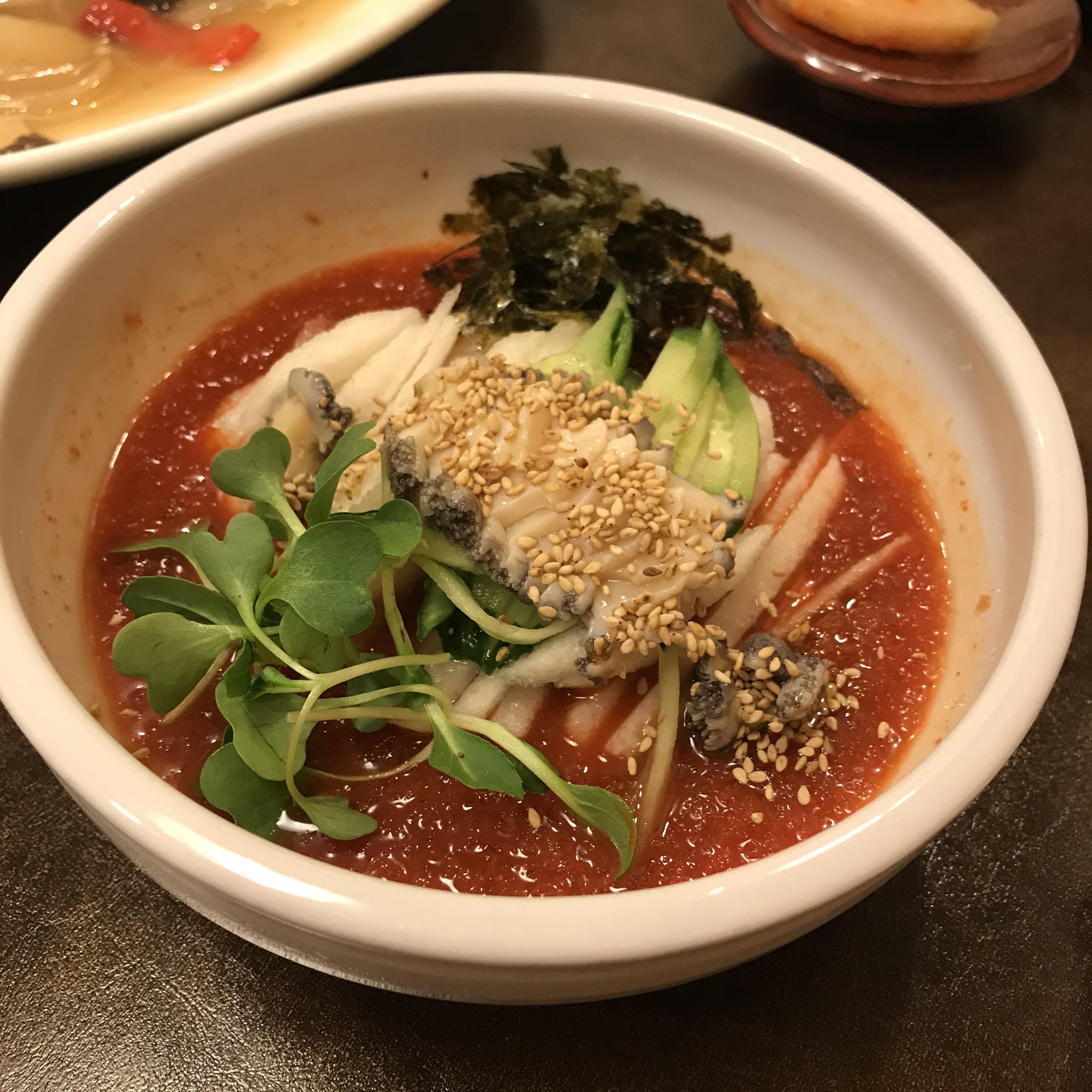 매콤한 물회 육수에 배, 새싹, 오이 등의 토핑과, 전복 회가 들어있었다. 맛있겠다.