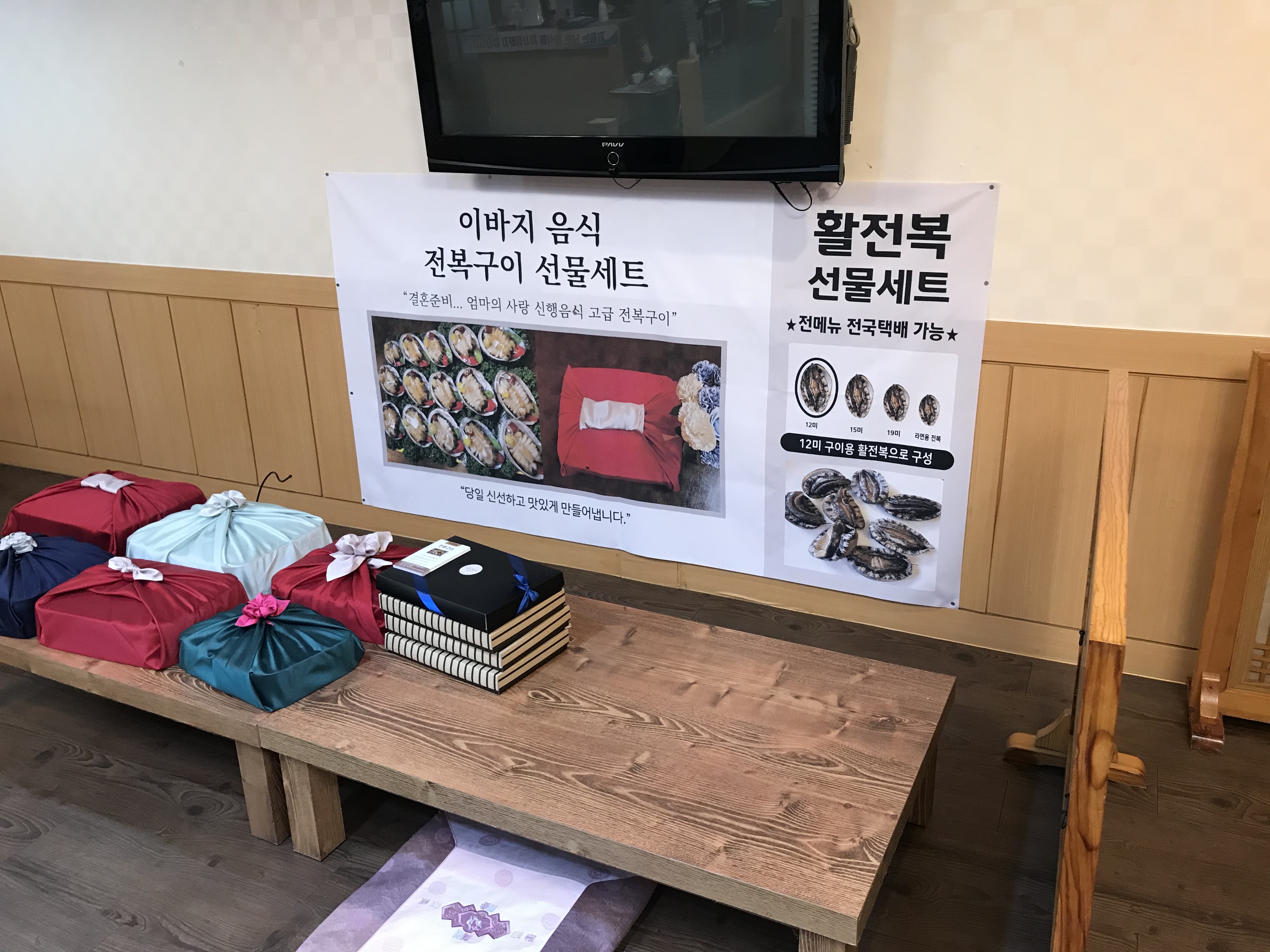경산 중방동 전복맛집 해수전복에서는 명절을 앞두고, 선물세트를 판매하고 있었다. 활전복 선물세트라니, 고급진 느낌이다. 하지만 직접 요리를 해 먹으려면 이를 제거하는 등의 손질이 좀 어렵겠다는 생각이 들었다.