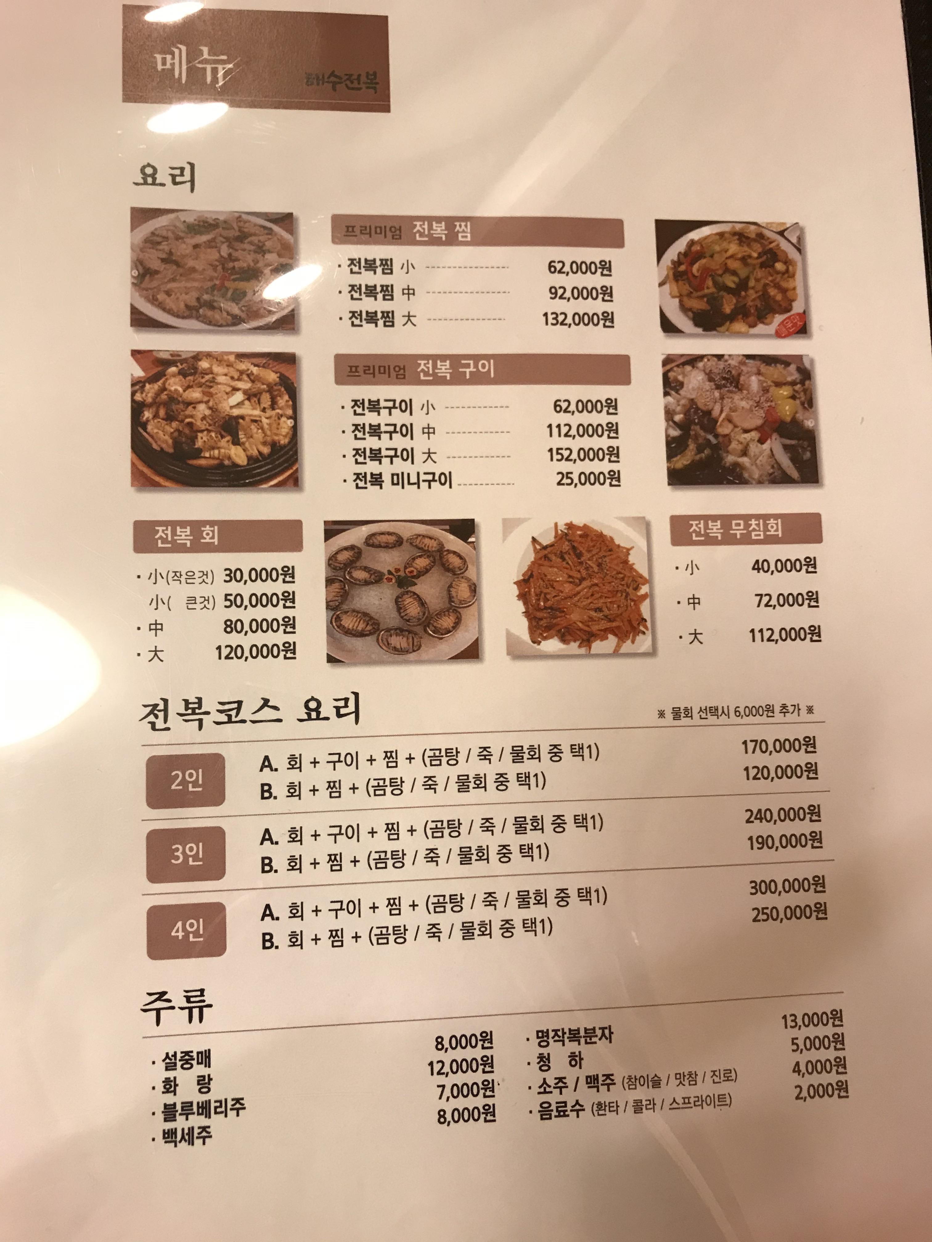 경산 중방동 전복맛집 해수전복의 메뉴판. 전복이 들어간 여러 단품 요리, 코스요리들이 있었는데 생각했던 것보다 더 가격이 높게 형성되어 있어서, 해수정식 세트를 시키기로 했다.