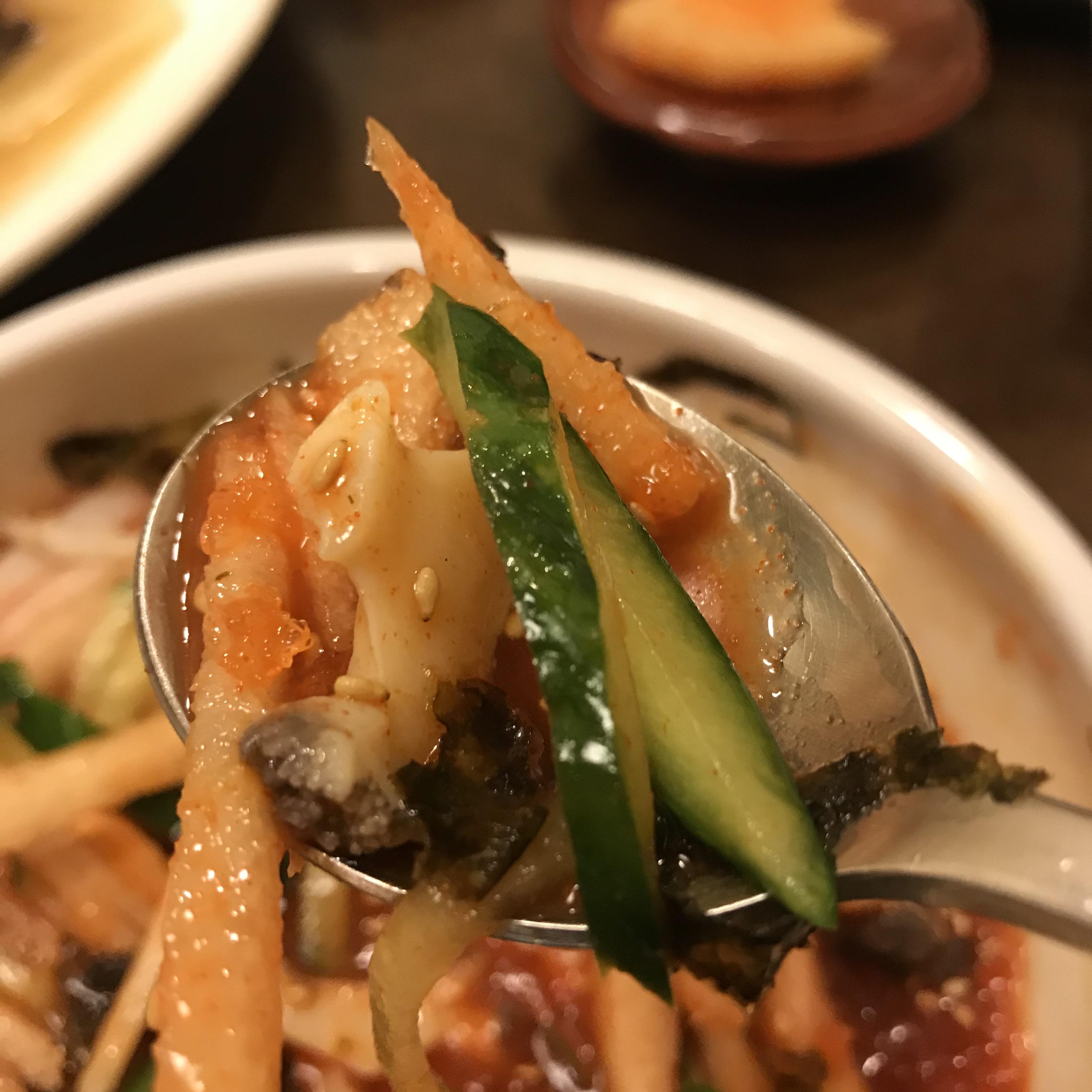 슥싹슥싹 비벼서, 한숟갈을 크게 뜬다. 채소와 배의 아삭한 식감과 전복회의 오독오독 쫄깃쫄깃한 식감이 새콤달콤 매콤한 물회 육수와 어우러져 맛있는 조화를 이뤘다. 조금 맵긴 했다. 매운 걸 많이 못 먹는 편이라, 좀 많이 매웠다. 전복회를 위주로 건더기를 건져 먹었다.
