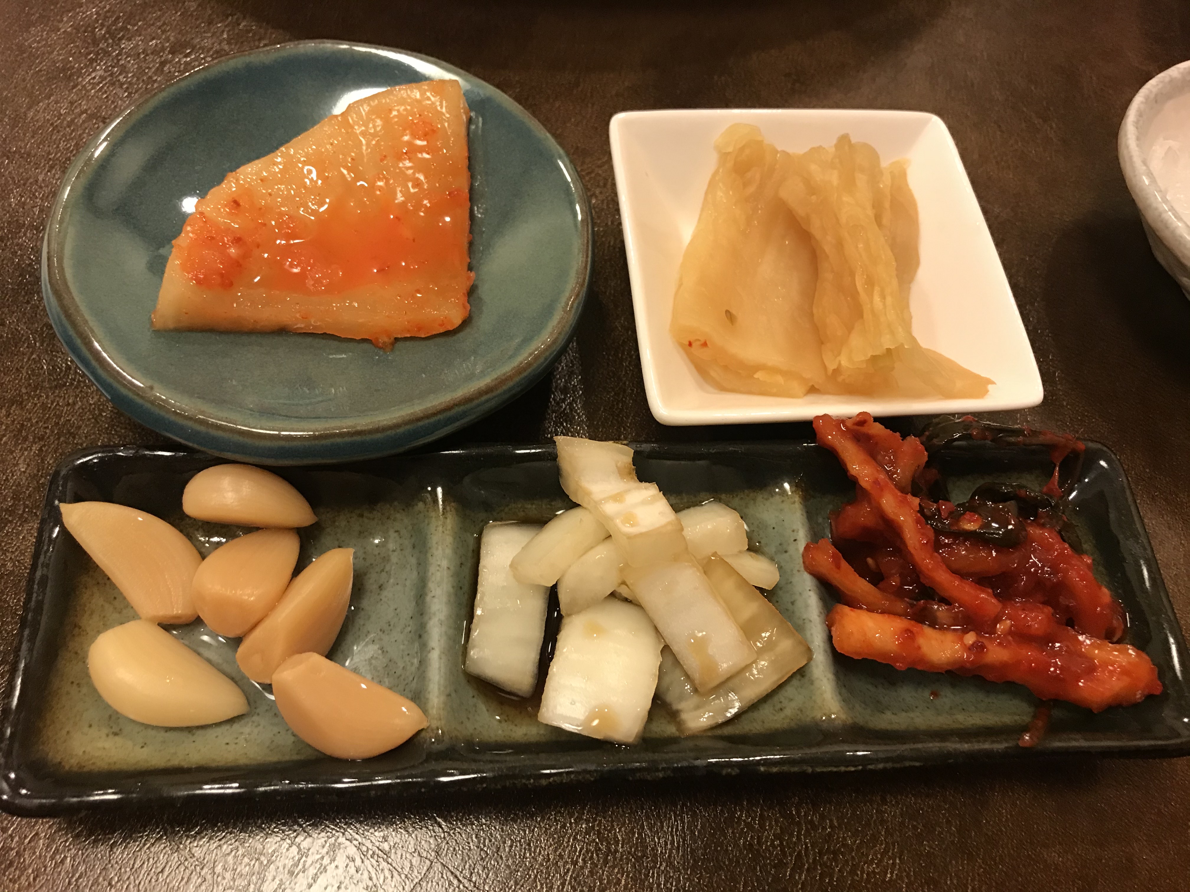 해수전복의 밑반찬, 깍두기, 백김치, 마늘장아찌, 양파절임, 무말랭이였다. 밑반찬이 군더더기 없이 맛있었다.