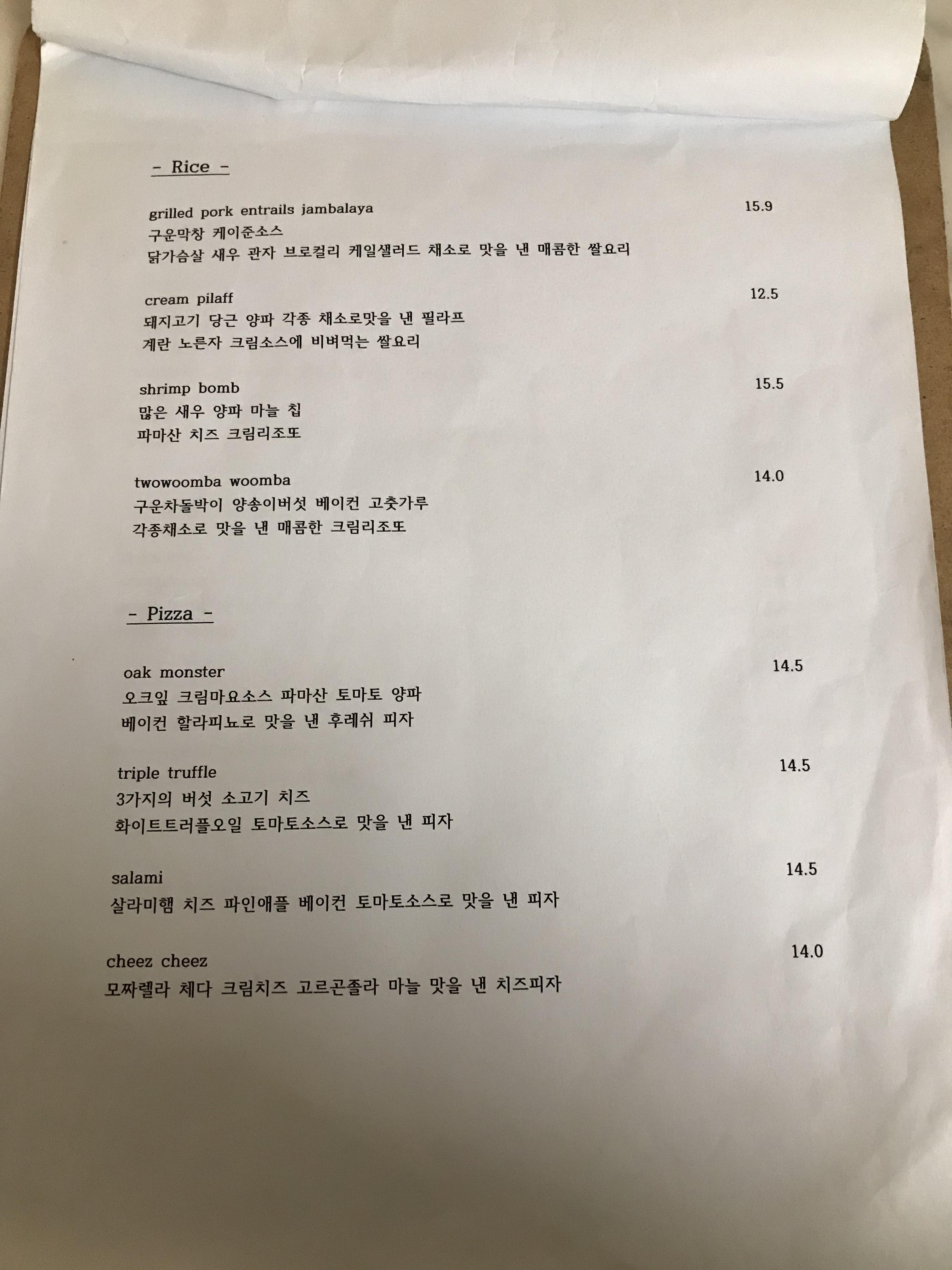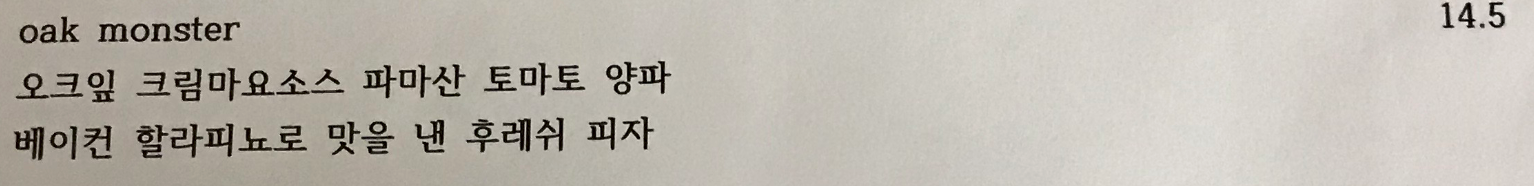 오크 잎, 크림마요소스, 파마산, 토마토, 양파, 베이컨, 할라피뇨로 맛을 낸 후뤠시 피자(oak monster)가 나왔다. 음식에 대한 설명에 식재료를 전부 적어줘서 친절하다고 느꼈다.
