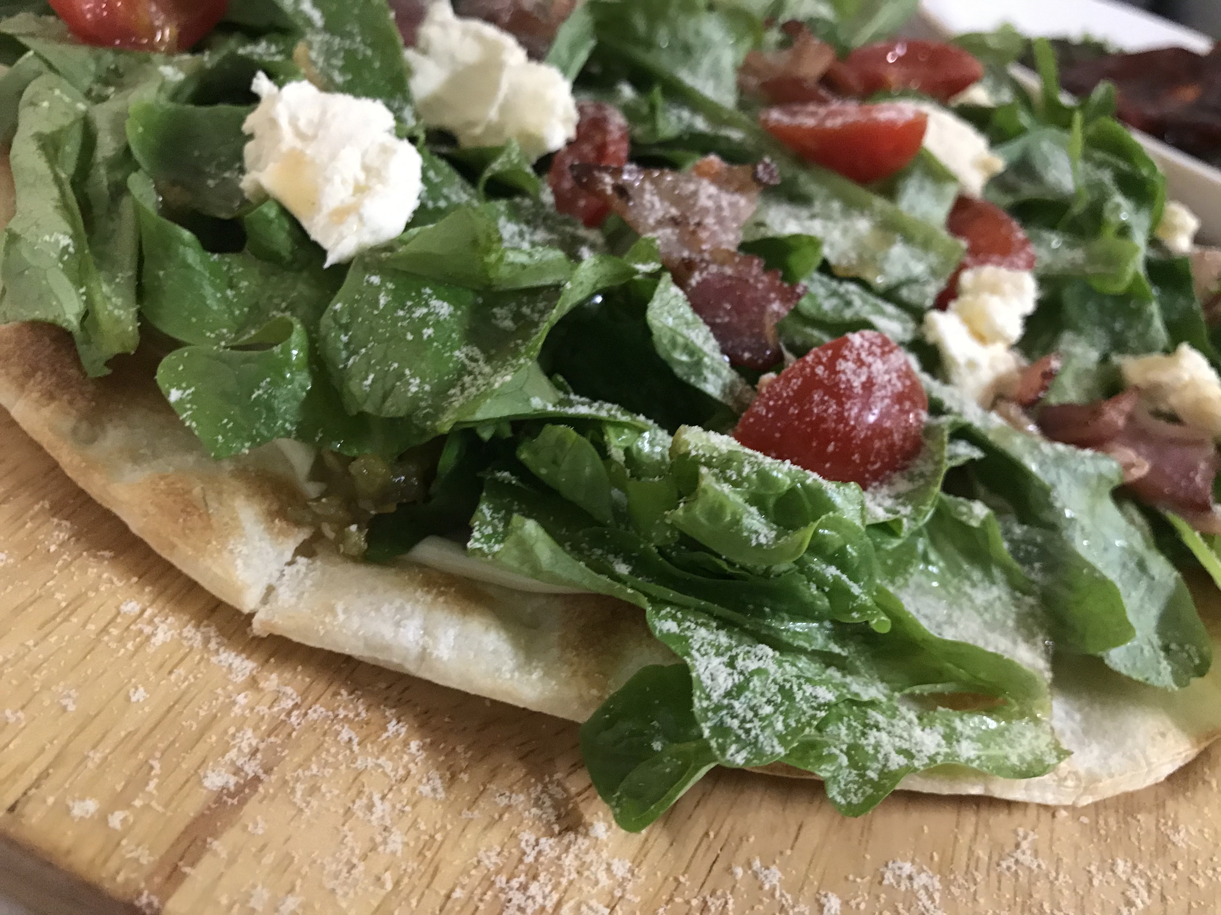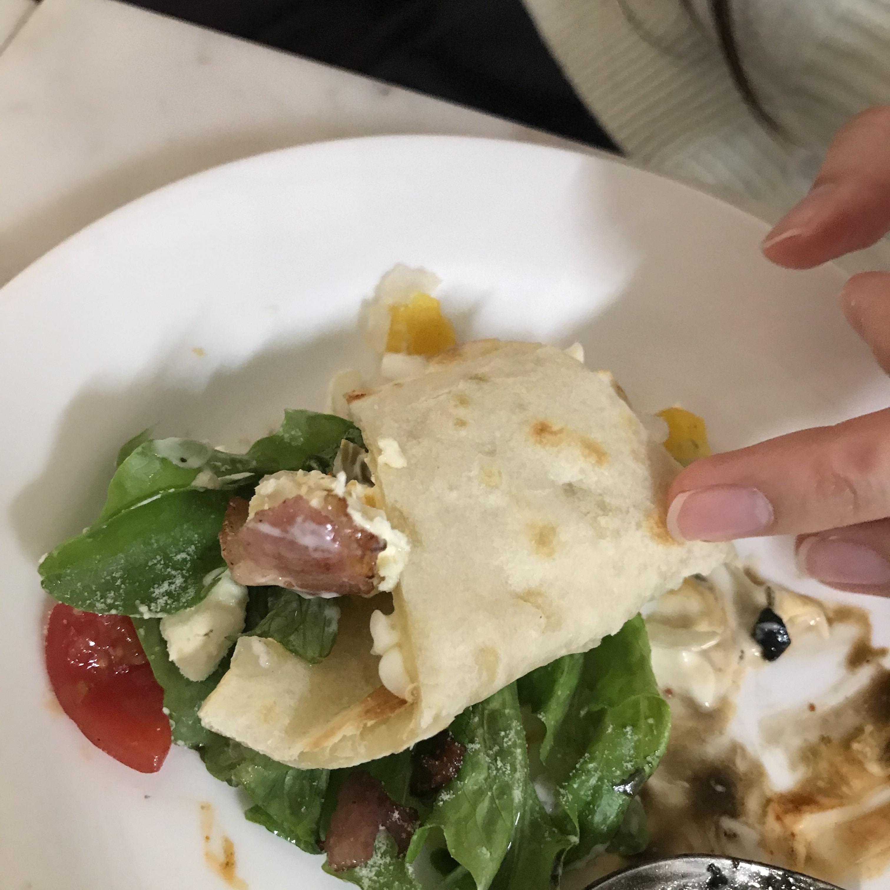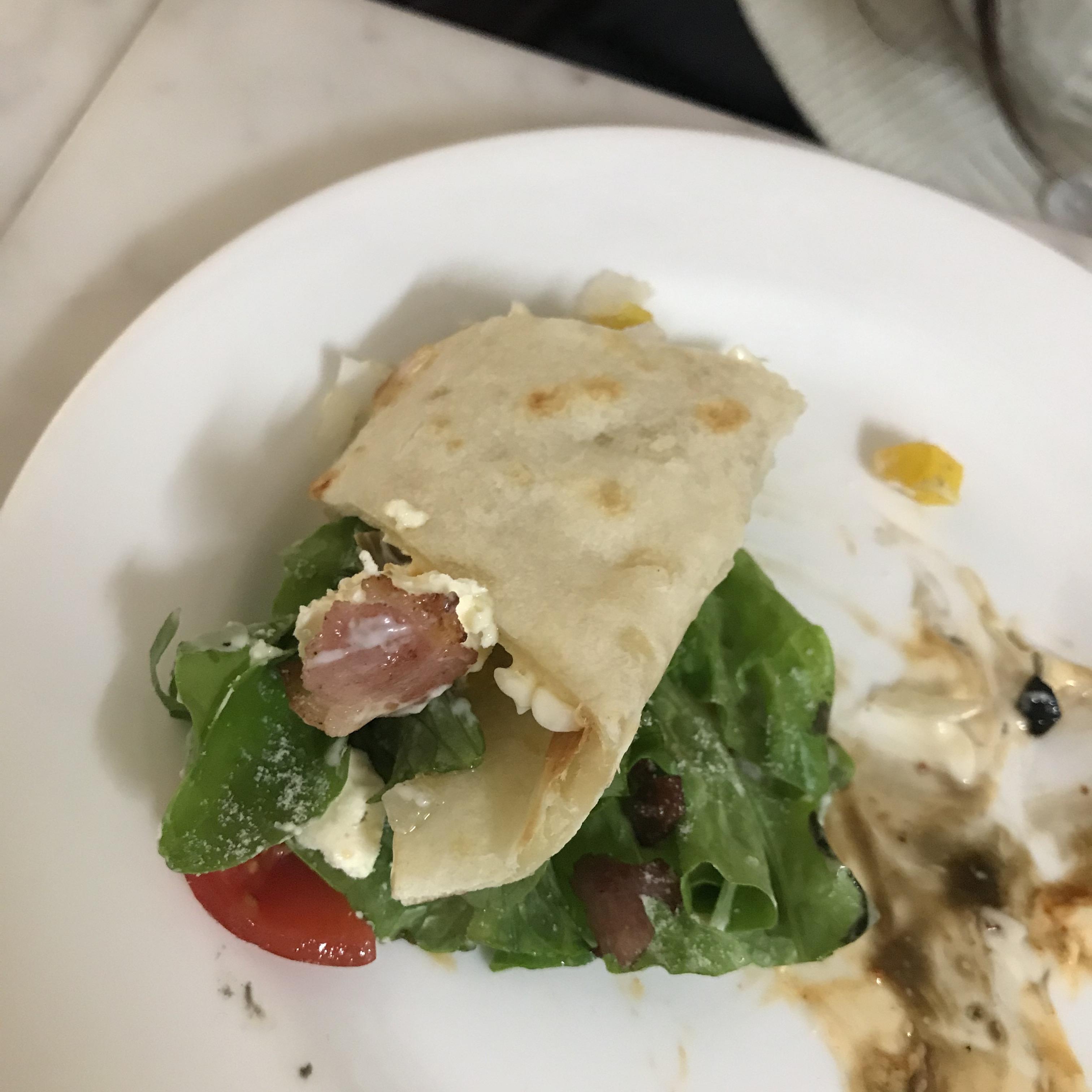 또띠아 처럼 도우를 말아서 먹는 방식을 추천해주셨다. 도우 위에 토핑이 따로 노는 편이라 제대로 말아지지 않아 대충 말아서 두입에 먹어치우고, 떨어진 토핑을 포크로 주워먹었다. 그래도 신선한 오크잎과 토마토와 베이컨의 식감이 살아있어 맛있었다. 하지만 토핑과 도우가 따로 노는 걸로 봐서 요리명을 피자라기보다는 말기 전의 또띠아라고 하는 편이 낫지 않나 싶었다.