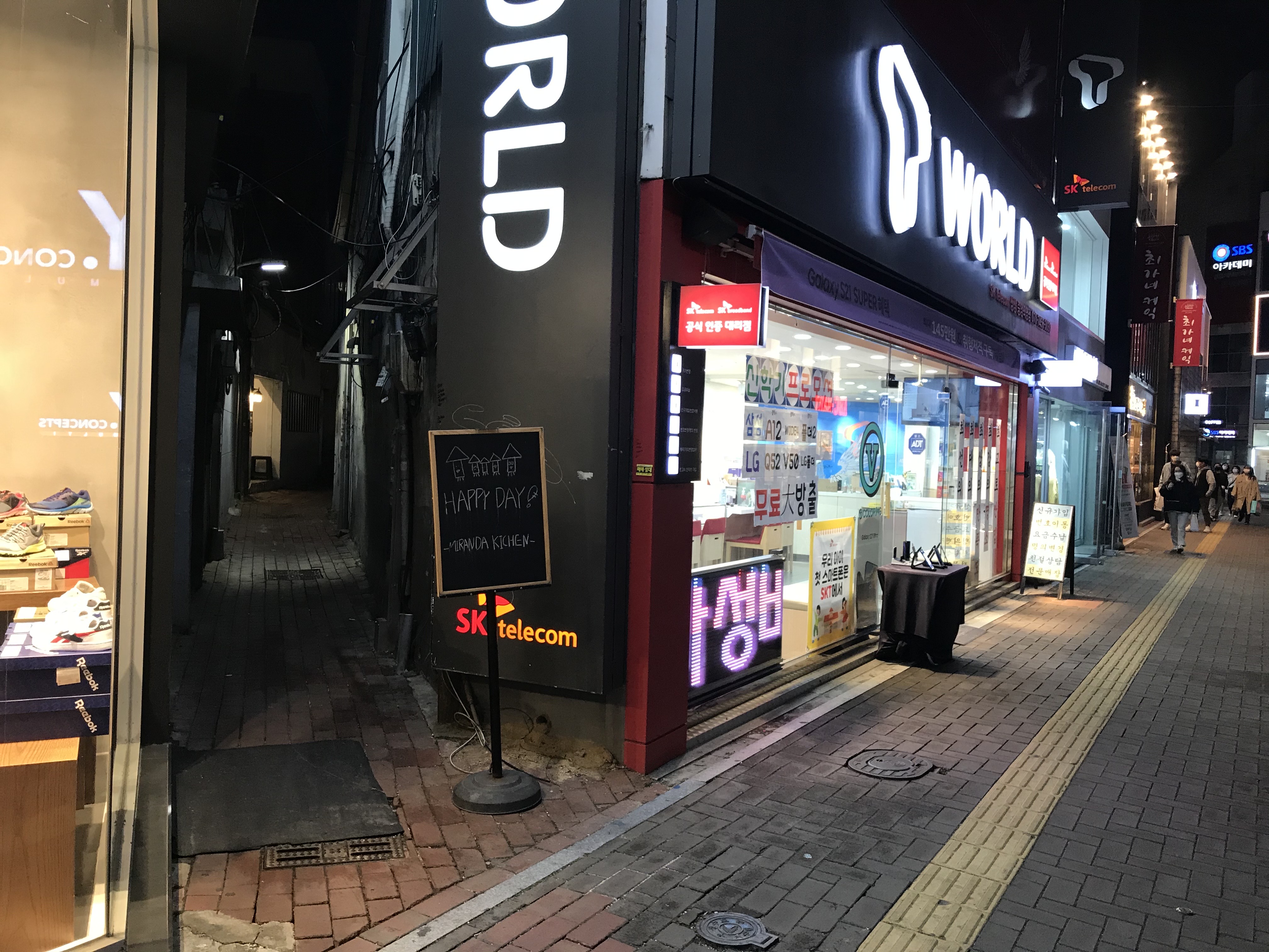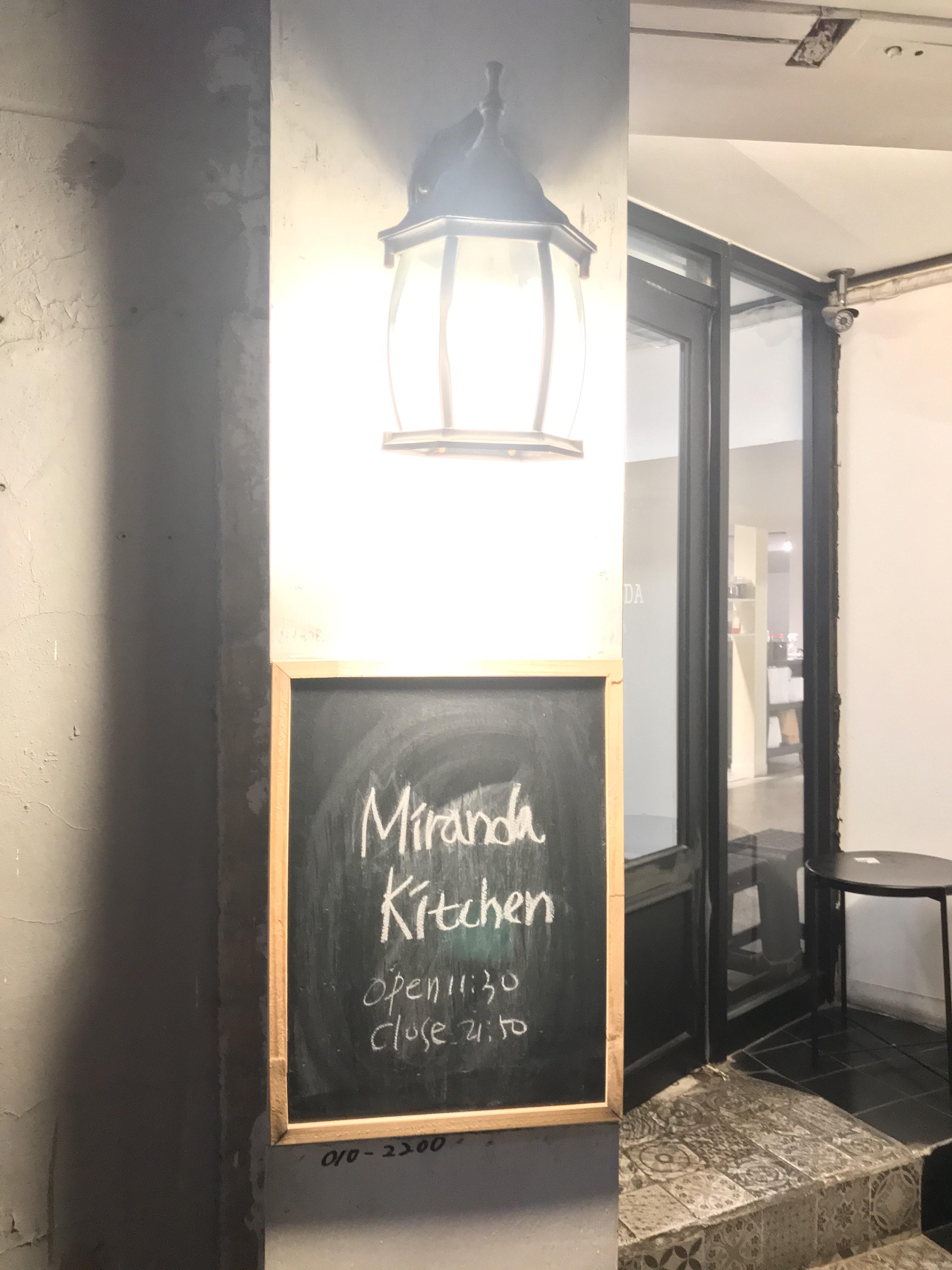 이렇게 칠판으로 된 입간판으로 미란다 키친의 입구임을 알리고 있다. 골목이 좁으니 놓치지 말고 잘 찾으시길. T월드 대리점과 리복 매장 사잇길이다.