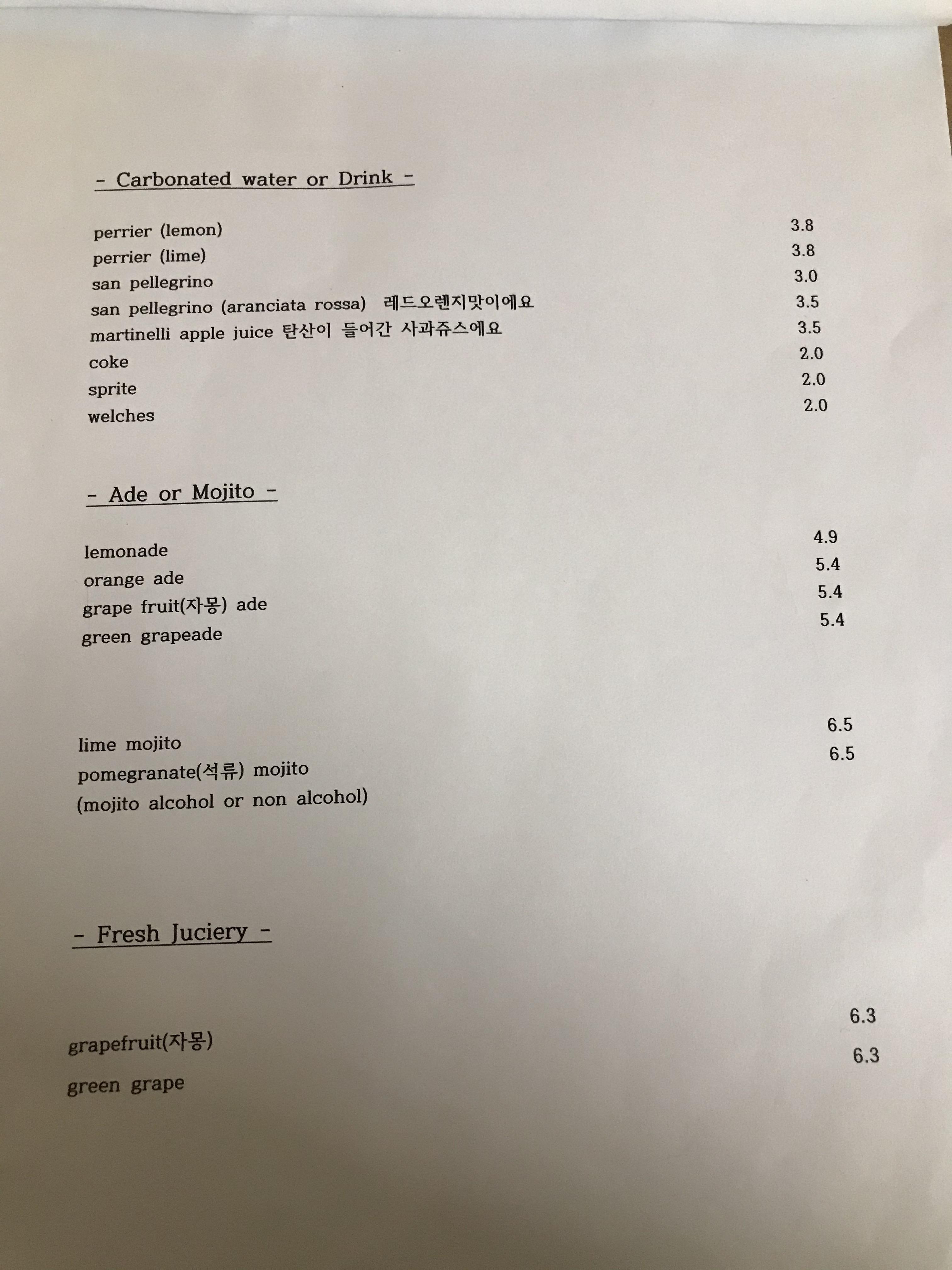 동성로 맛집 미란다 키친의 메뉴판. 늘 가면 먹는 시그니처 메뉴인 통오징어 먹물 파스타(different calamari), 오크잎 크림마요소스 파마산 토마토 양파 베이컨 할라피뇨로 맛을 낸 후레쉬 피자(oak monster)와 사이다를 시켰다. 먹물 파스타는 올 때마다 시키는 시그니처 메뉴고, 두번 째 메뉴는 피자나 리조또 등 그때그때 먹고 싶은 걸로 고르는 편이다.