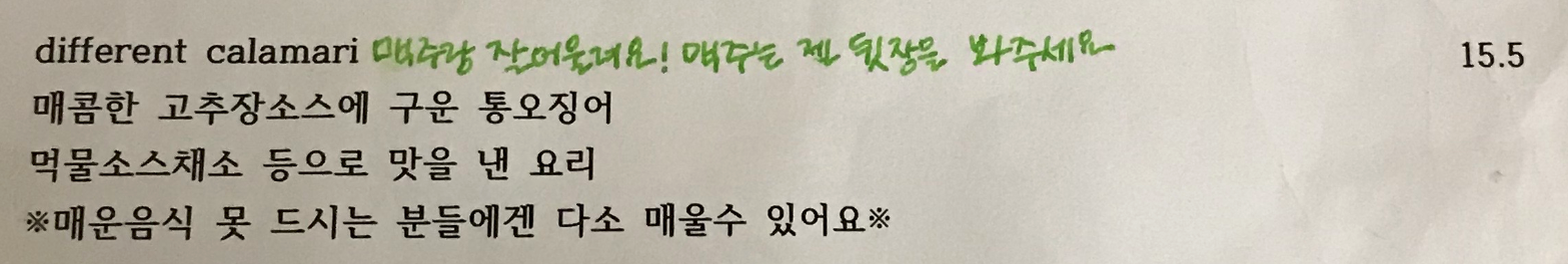 - 통오징어 파스타는 조금 맵지만, 뭔가 중독성 있게 맛있어서 나 같은 맵찔이들도 맛있게 맵다고 생각하며 먹을 수 있는 정도다(나는 매운 쭈꾸미나 붉닭 같은 것도 정말 못 먹는 편이다...). 정말 김치도 못 먹을 정도로 맵찔이가 아니라면 도전해볼 수 있을 정도라고 생각한다.