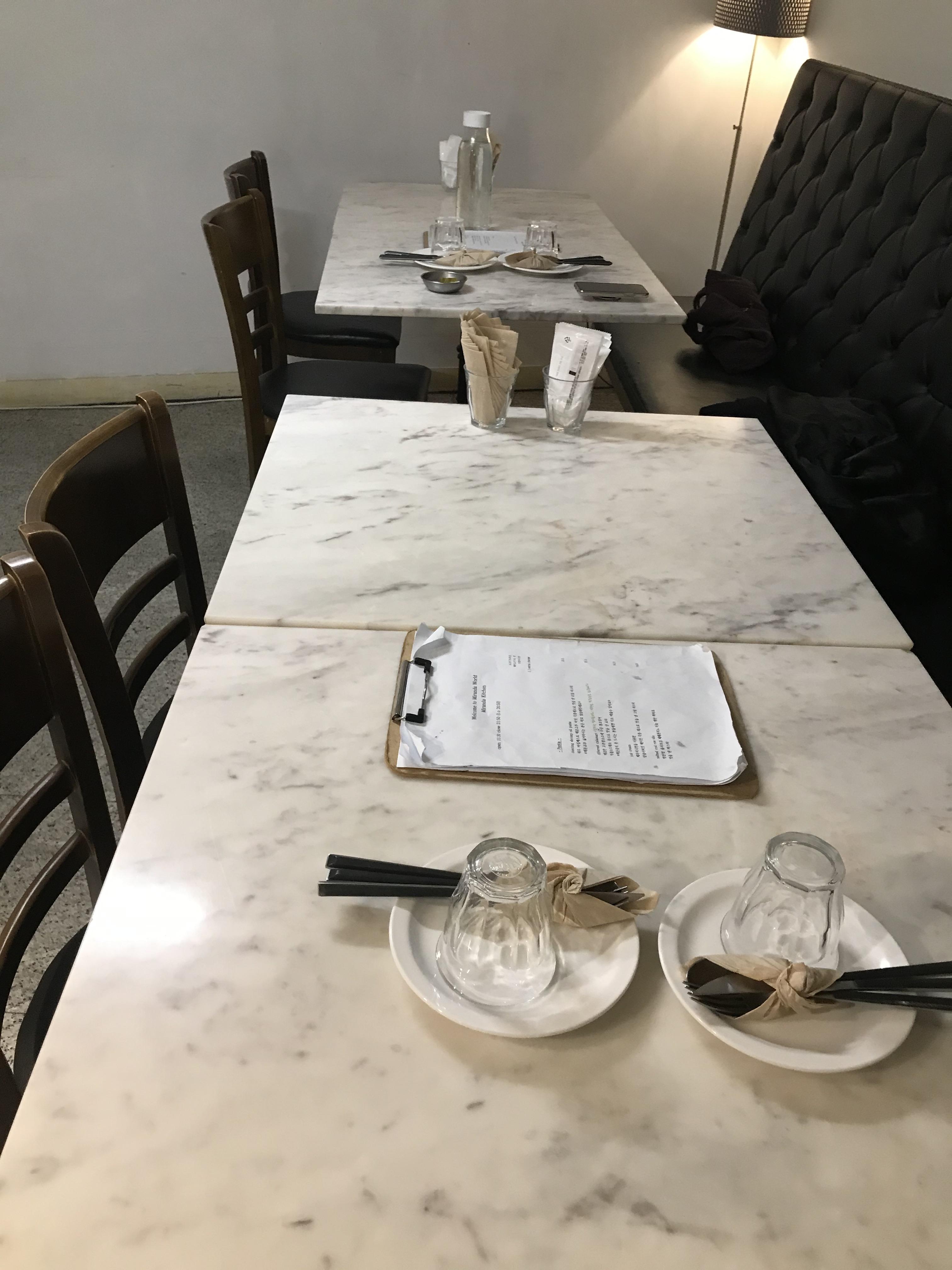 좌석마다 식기가 세팅되어있었고, A4용지에 인쇄한 메뉴판이 우드 클립보드에 끼워져 있었다.