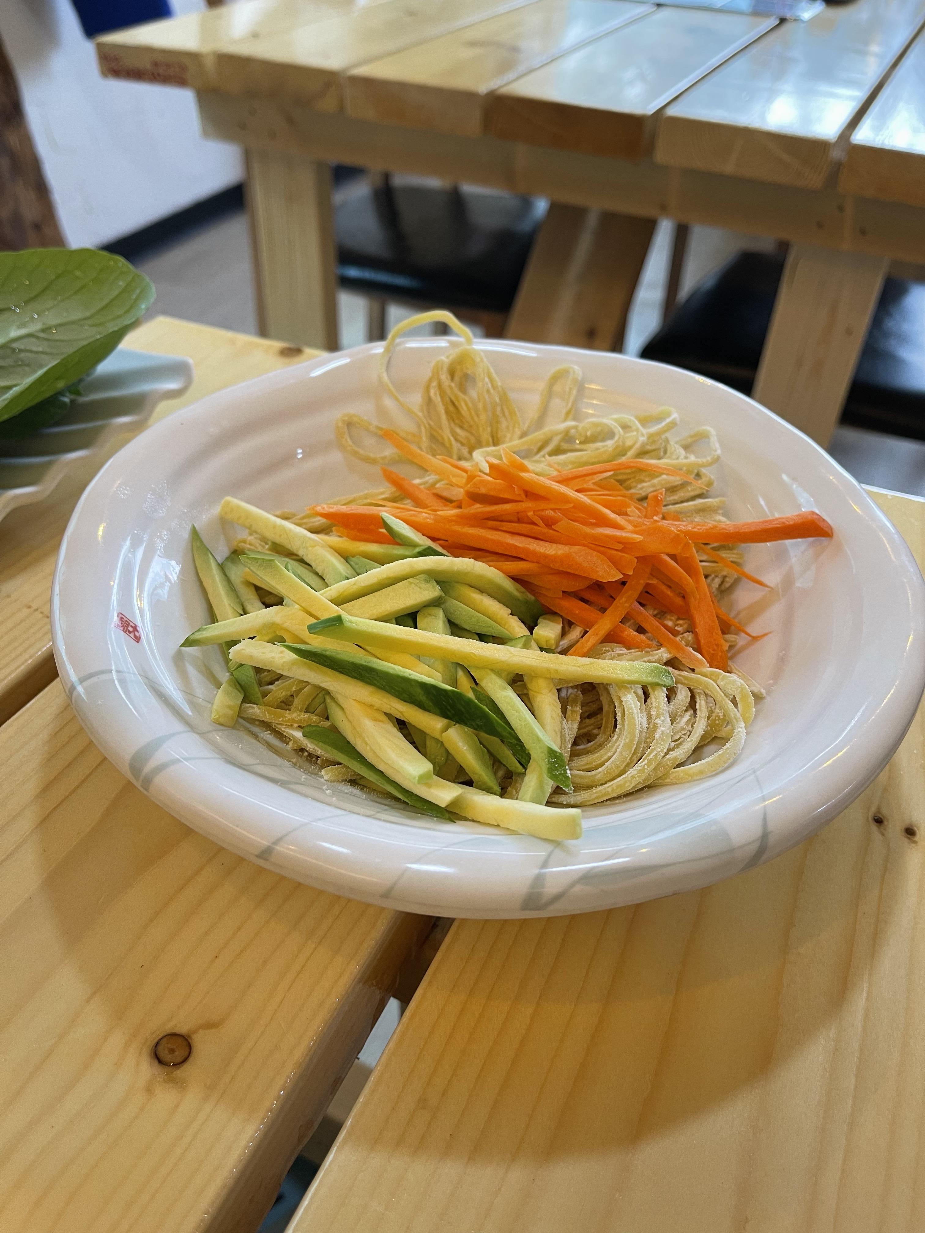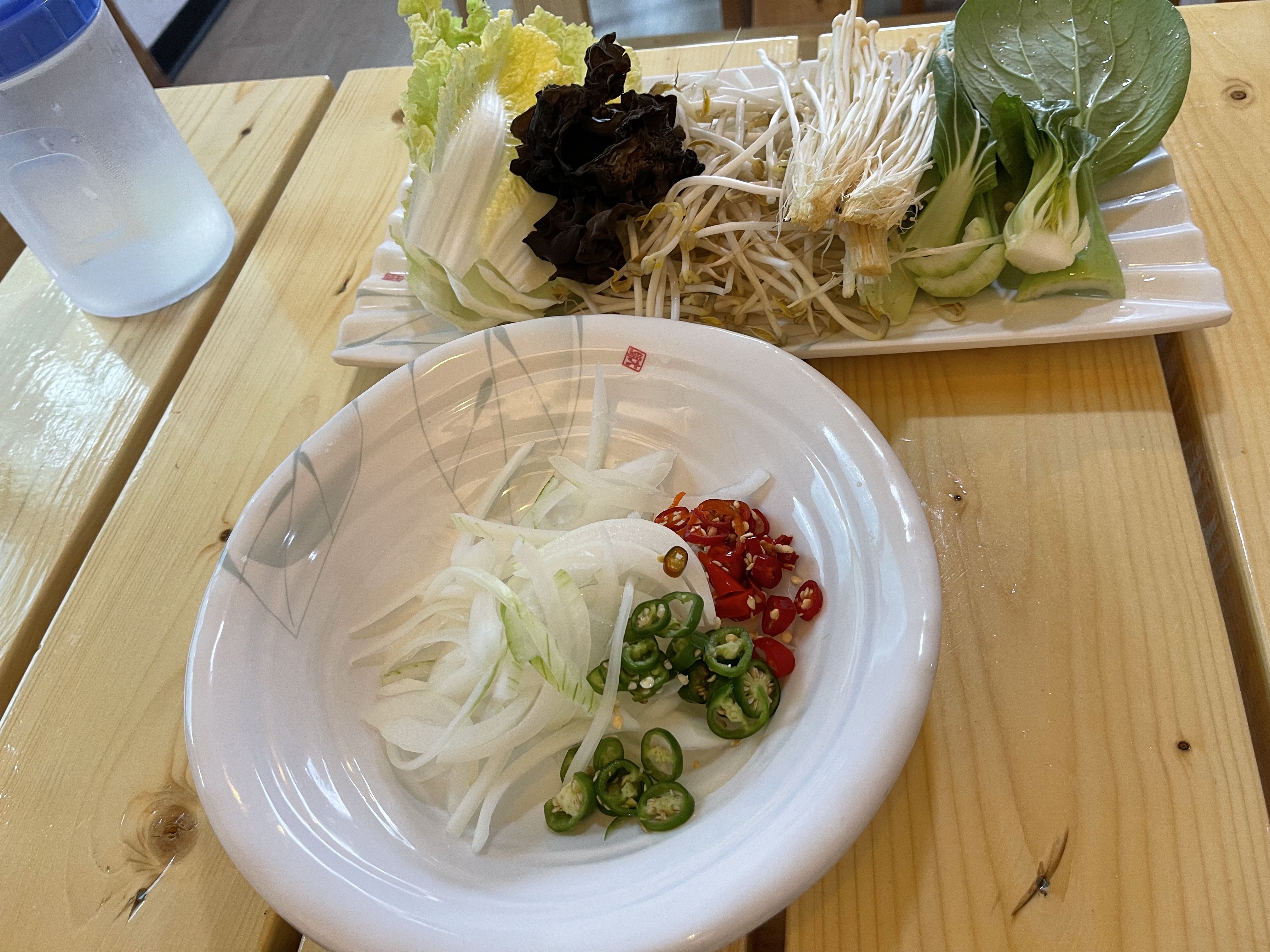 고기와 곁들여 먹을 양파절임용 슬라이스 양파와, 국물용 혹은 소스용으로 추가된 청양고추 토핑, 육수에 넣을 모둠 야채들이 준비되었다.