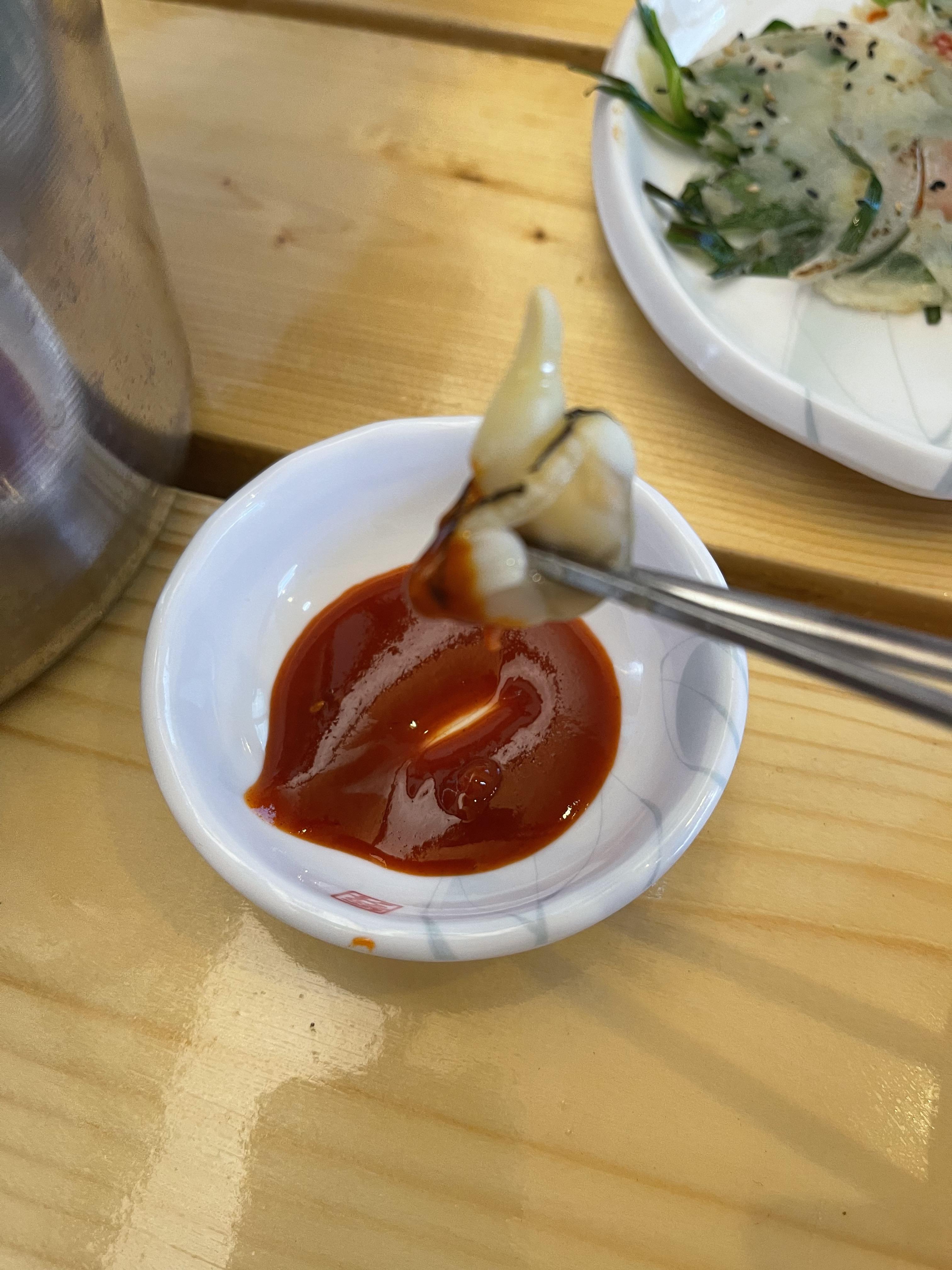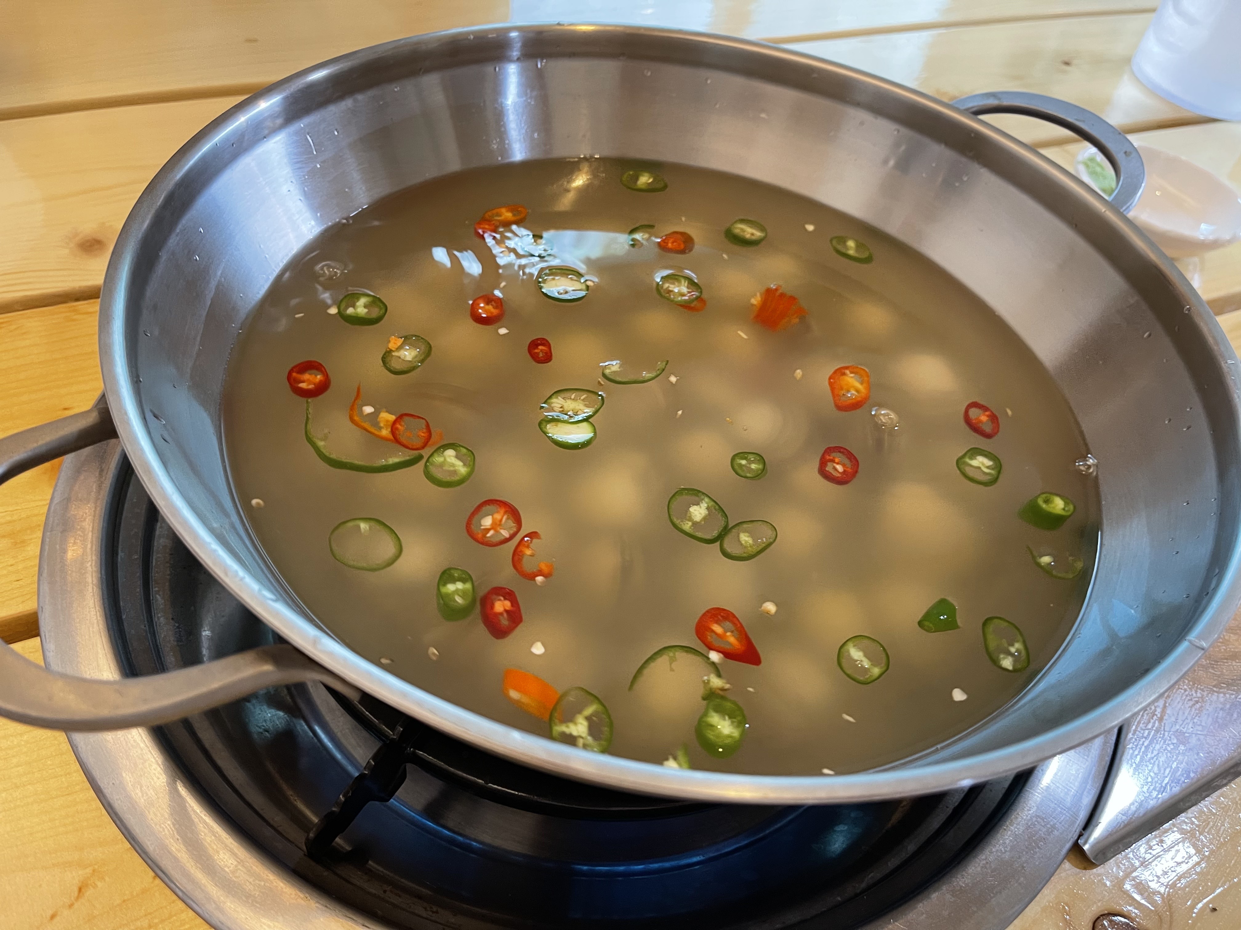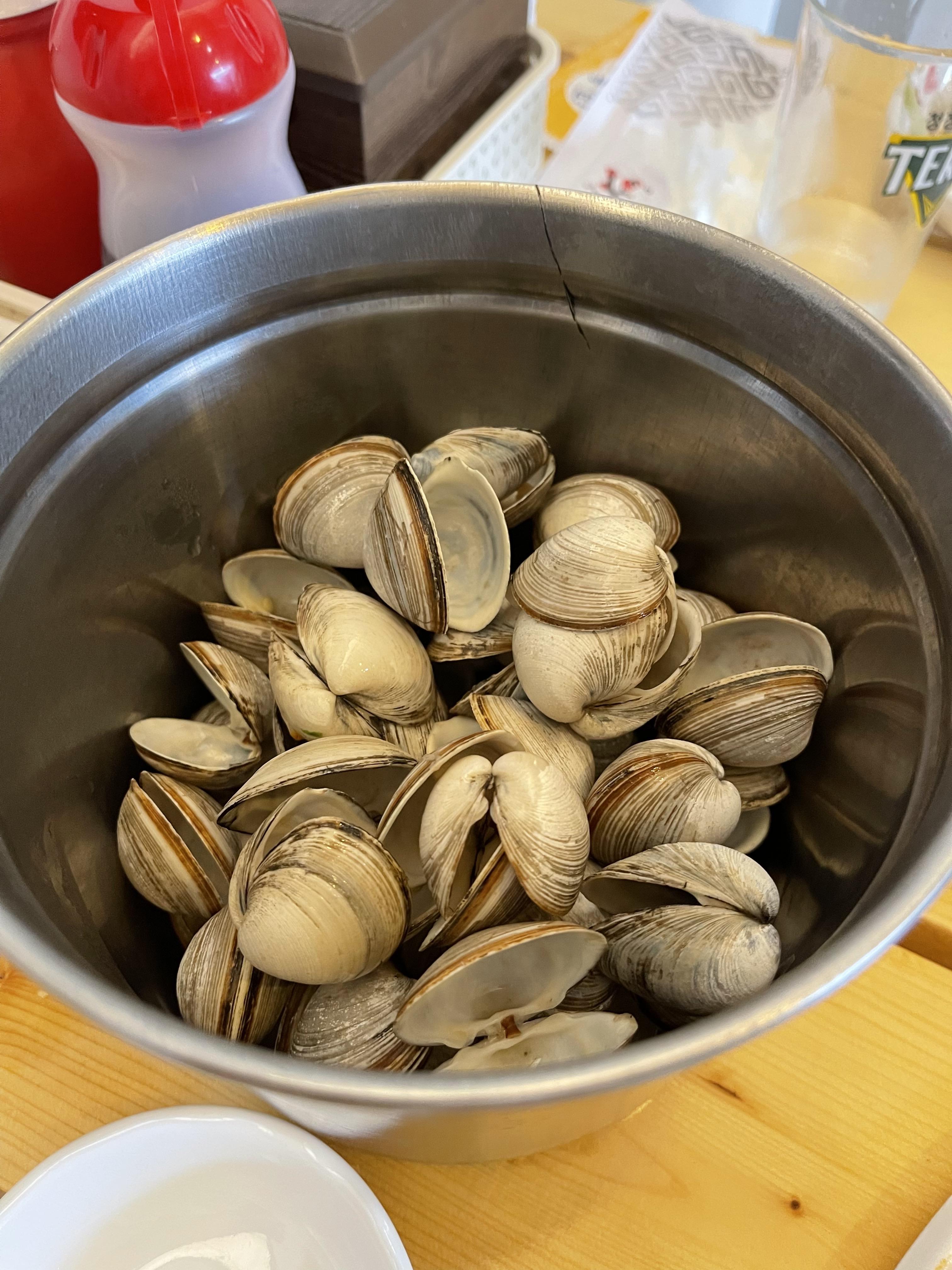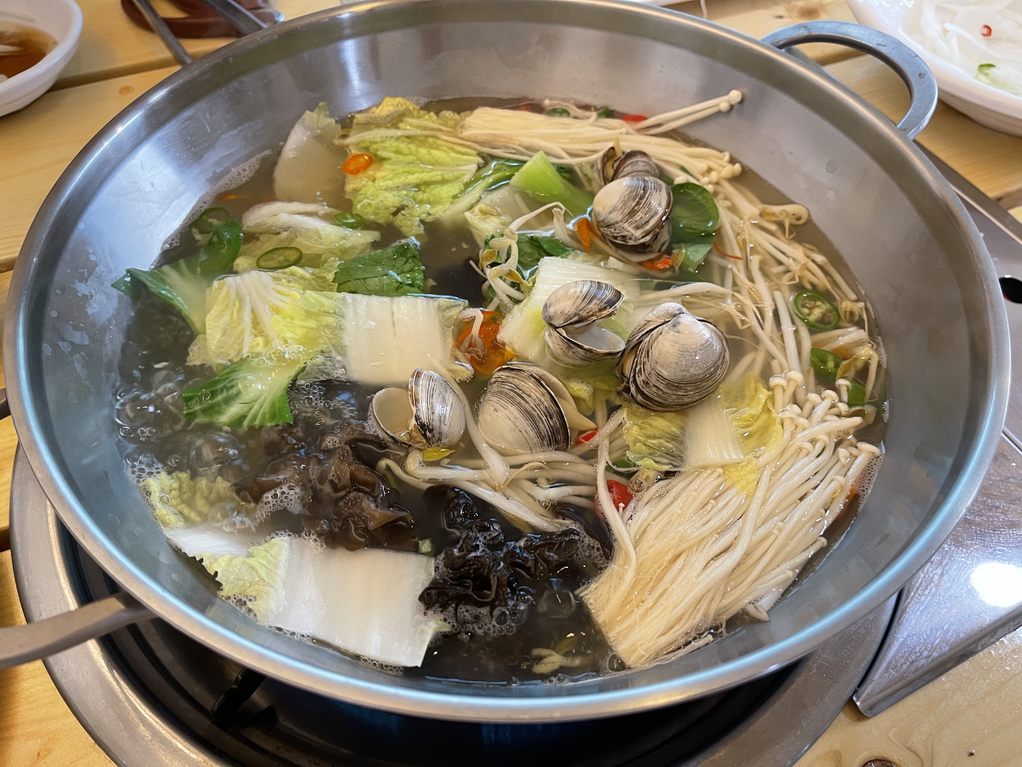 육수가 먼저 나왔다. 냄비 밑이 가득 차도록 조개가 채워져 있었고, 매콤한 청양고추를 송송 썰어놓으셨다.