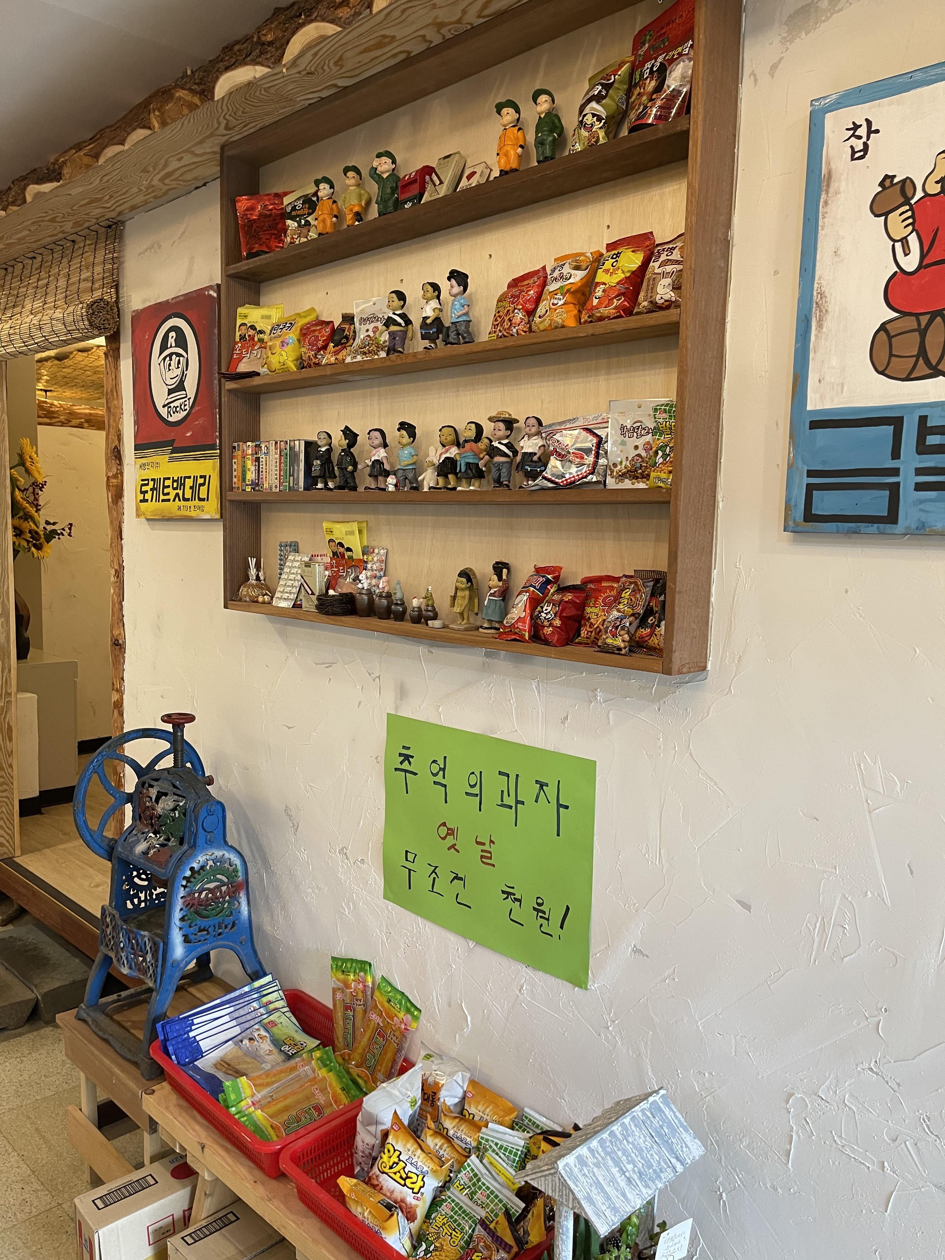 식사를 다 하고 가게를 휘~ 둘러봤다. 옛날의 향수를 많이 불러일으키는 옛날 과자, 옛날 브랜드 포스터, LP판 등의 소품으로 가게를 장식하고 계셨다. 밭두렁과 꾀돌이를 정말 오랜만에 봤다. 같이 간 귀염둥이는 아는데 나는 모르는 그런 과자들도 있었다. 깔끔한 인테리어의 세련된 식당이 아닌 올드한 감성이 가득한 식당이었다. 식탁 밑에서 거미가 나올 정도로 친환경적이기도 했다만 나쁘지는 않았다. 따뜻한 국물과 소고기, 조개 샤브샤브를 즐길 수 있었던 샤브샤브 맛집 해물전빵이었다.