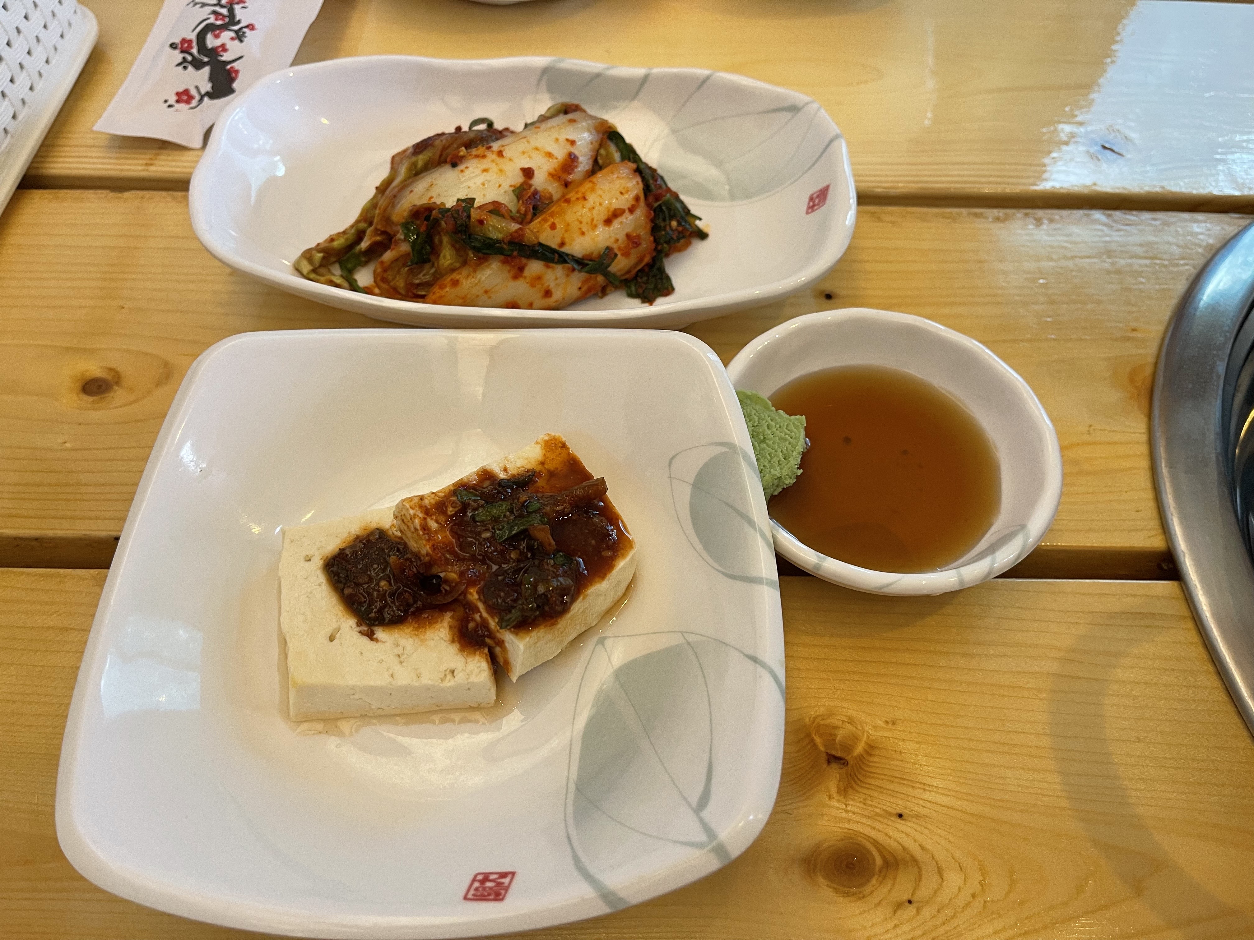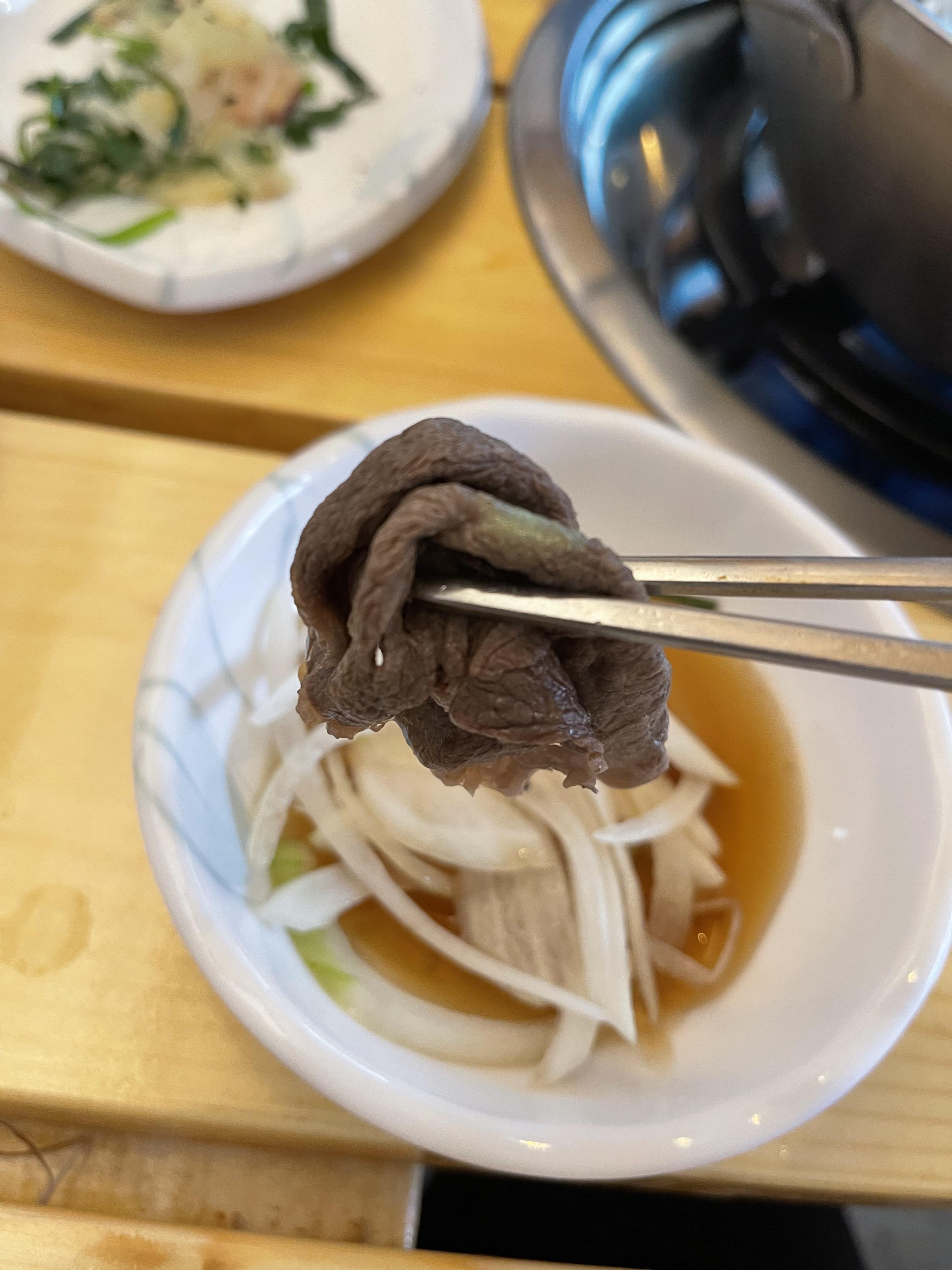 한우는 너무 오래 국물에 담가놓으면 퍽퍽해지기 때문에 익었다 싶으면 집어먹으면 된다. 와사비 간장에 살짝 찍어서 고기 본연의 맛을 즐겼다. 고기가 맛있다.