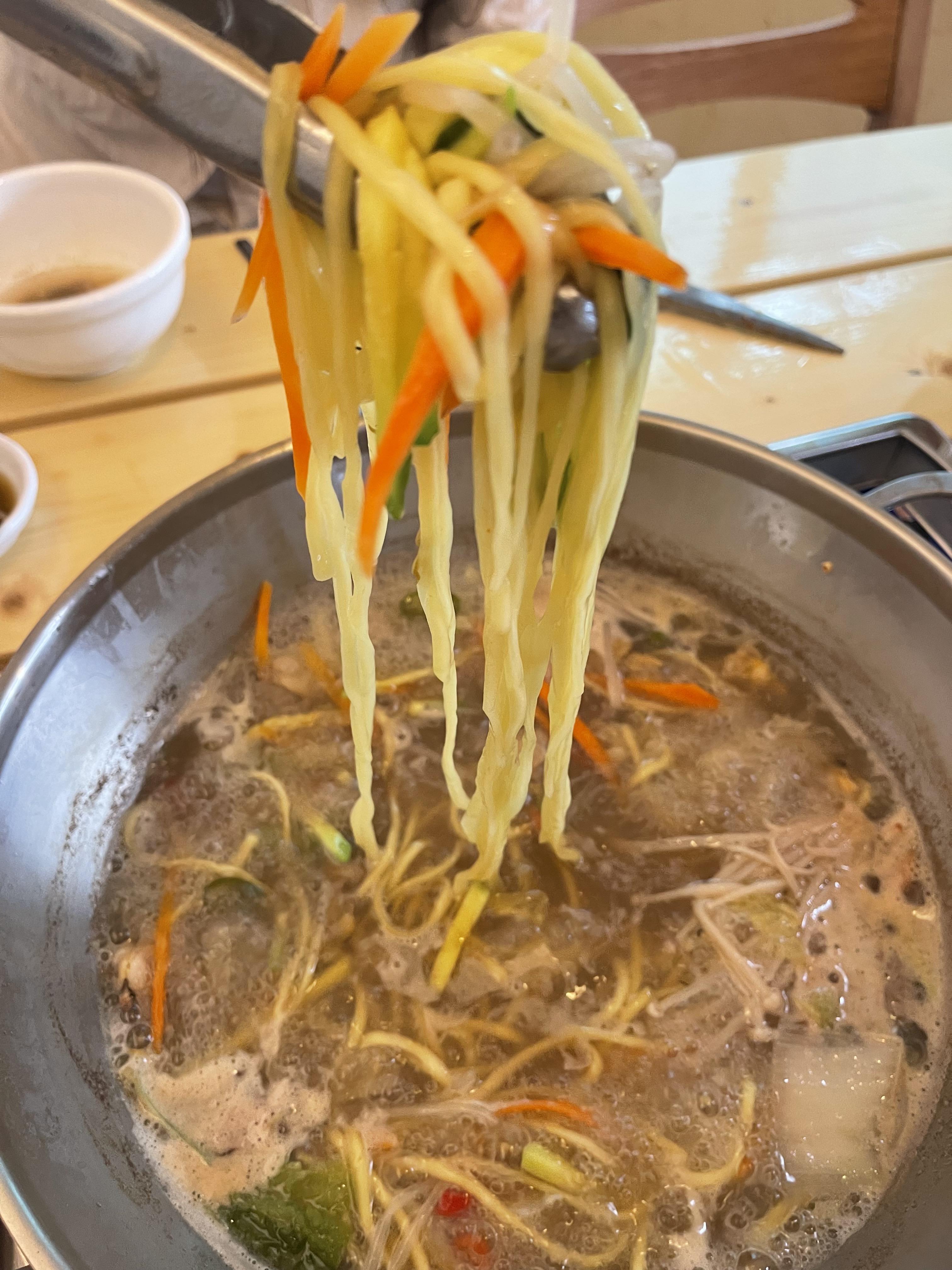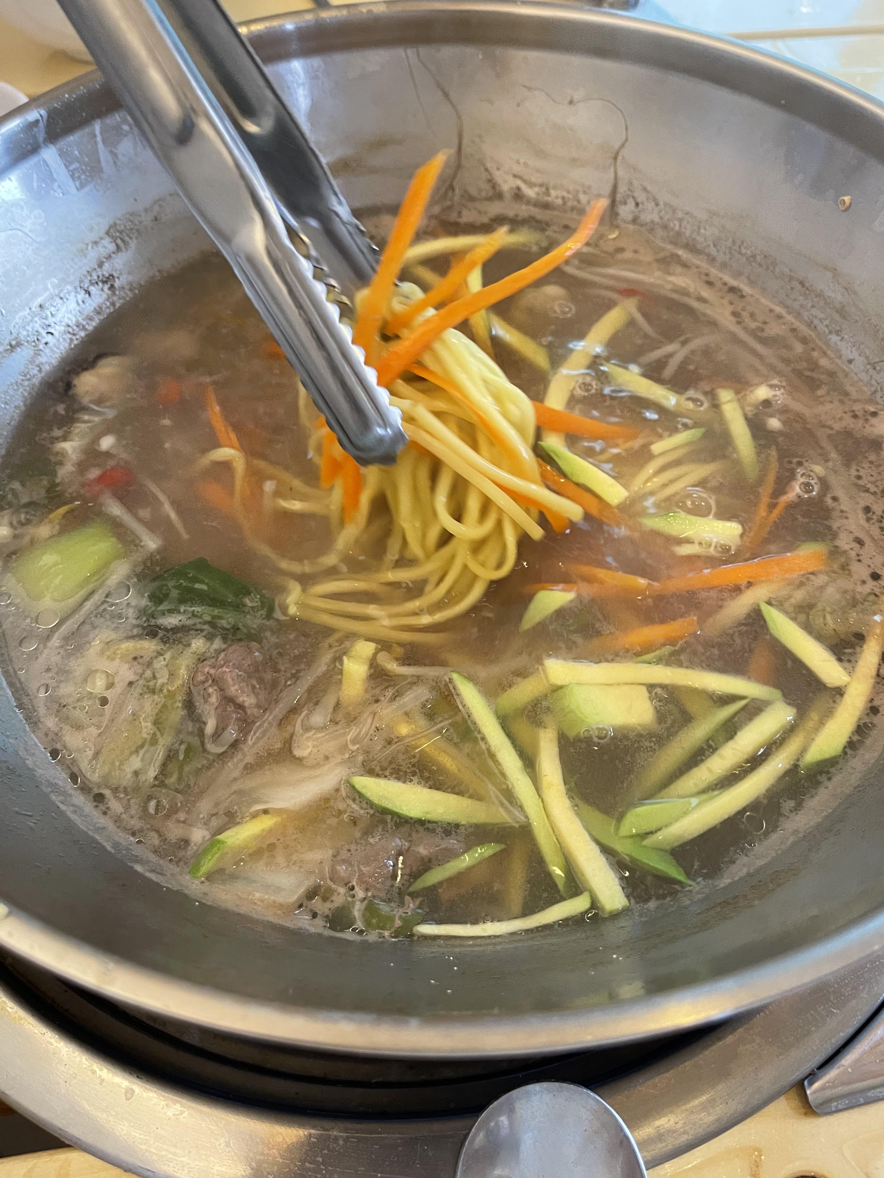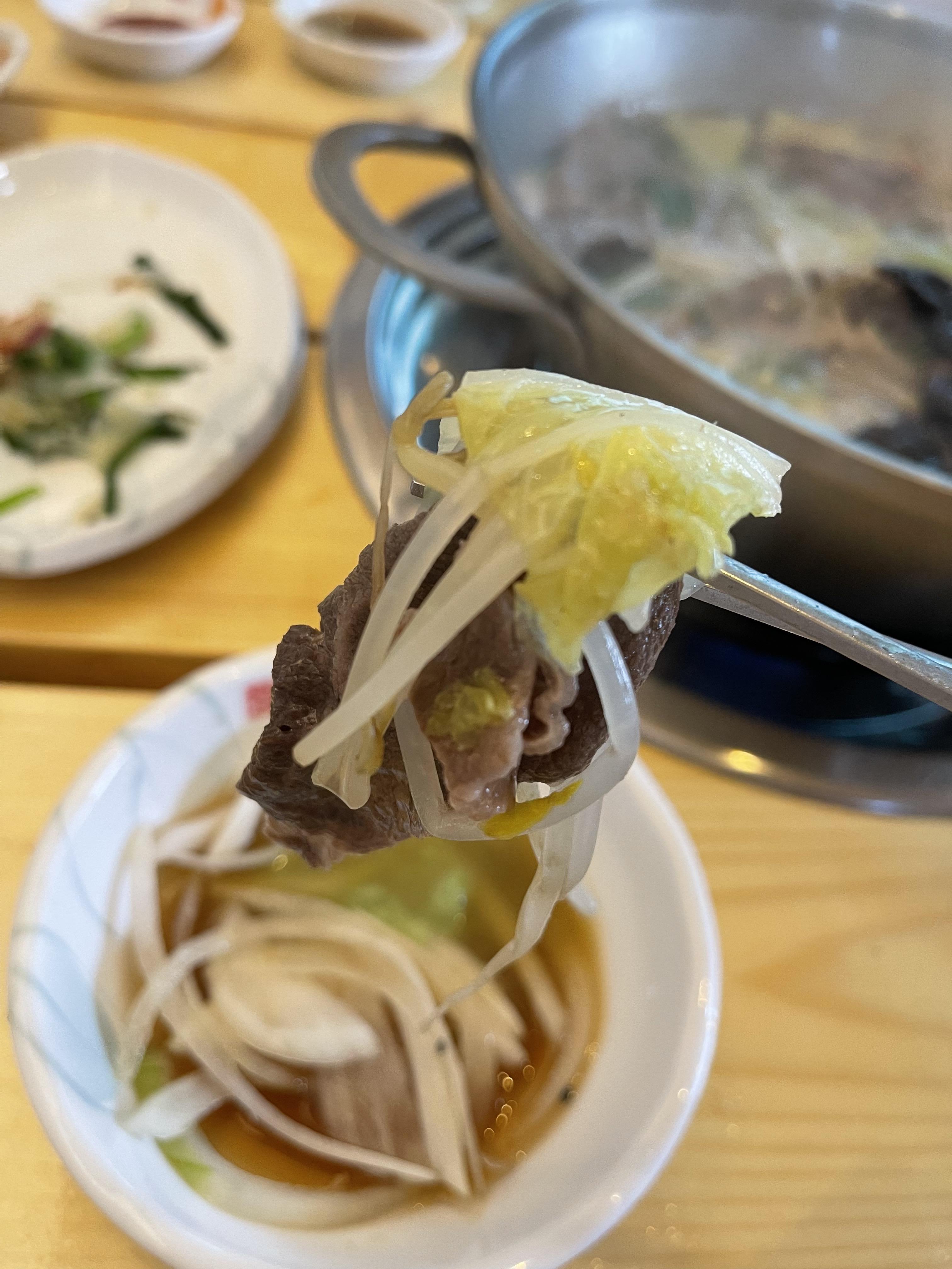 샤브샤브의 묘미는 푹 익힌 야채들과 고기를 함께 먹는 거다. 국물에 푹 익힌 야채와 소고기 샤브샤브의 식감이 잘 어울린다. 담백하게 맛있다. 고기와 조개를 한참 찍어먹고는, 이제 국수를 즐겨보기로 한다.