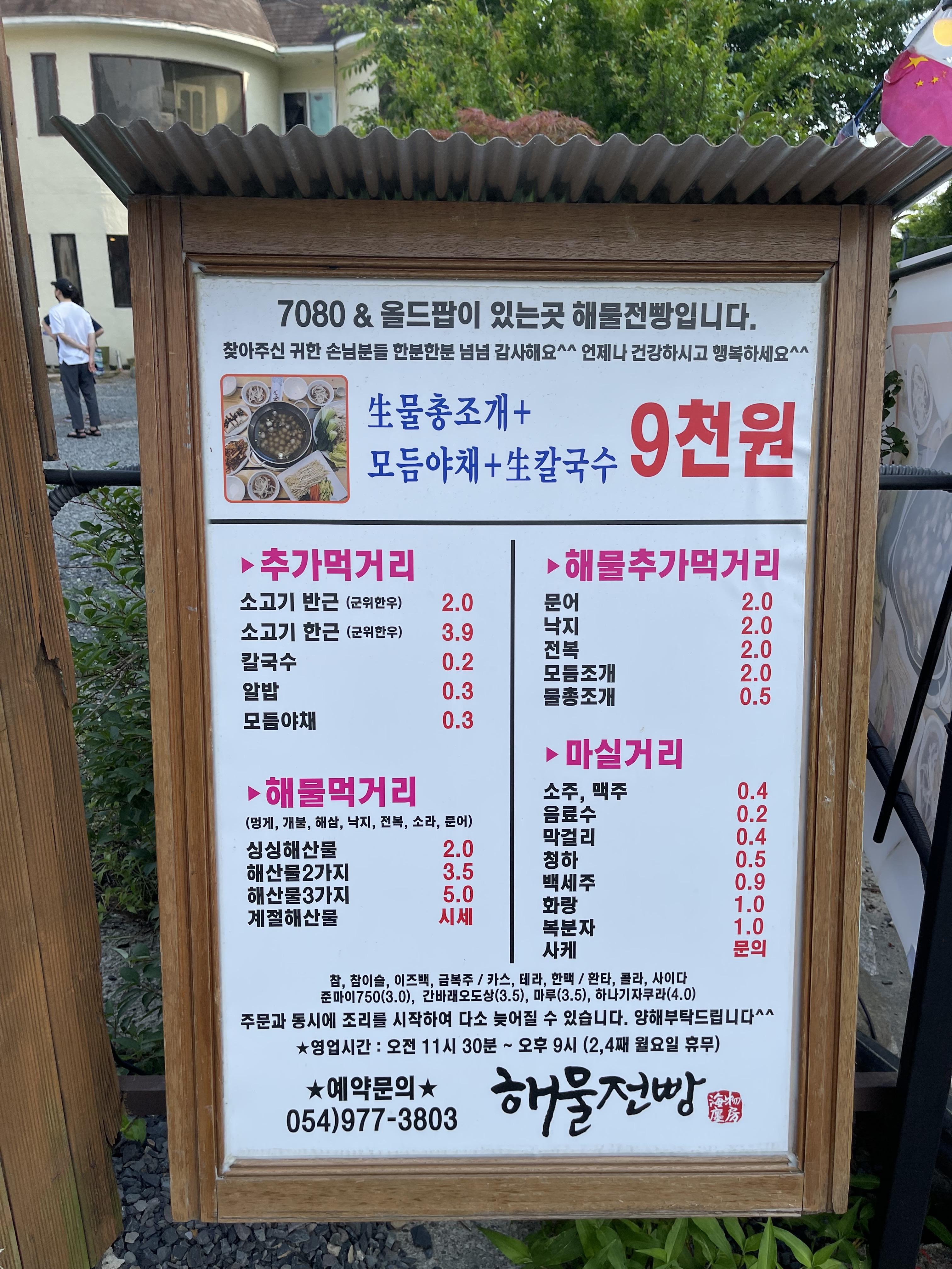 팔공산 맛집 해물 전빵에 도착했다. 메뉴판을 밖에서 볼 수 있어 미리 먹을 메뉴를 정했다. 물총조개와 야채가 들어간 칼국수에 소고기 샤브샤브를 시켜먹으면 되겠다.