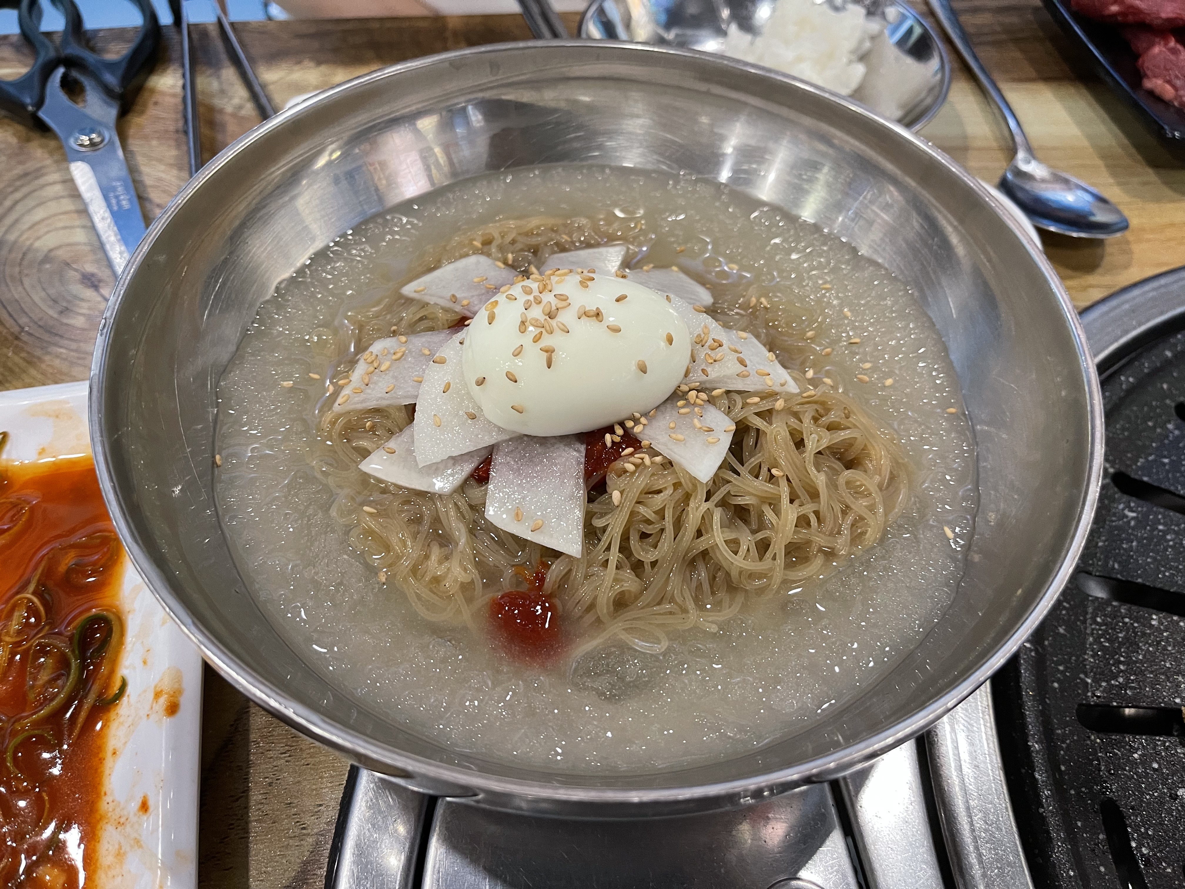공기밥과 된장찌개를 시켰다. 된장찌개가 4천원이나 했다. 보통은 2천원 정도 하는데, 왜 비싼가 했더니 우거지? 시래기?가 잔뜩 들어가 있었다. 집에서 끓인 된장 맛이 났다. 맛있다. 든든한 느낌이라 밥을 한공기 더 먹고 싶었다. 하지만, 한우를 먹으러 왔으면 밥과 된장찌개만 맛볼 수는 없지, 그렇다. 냉면이다.