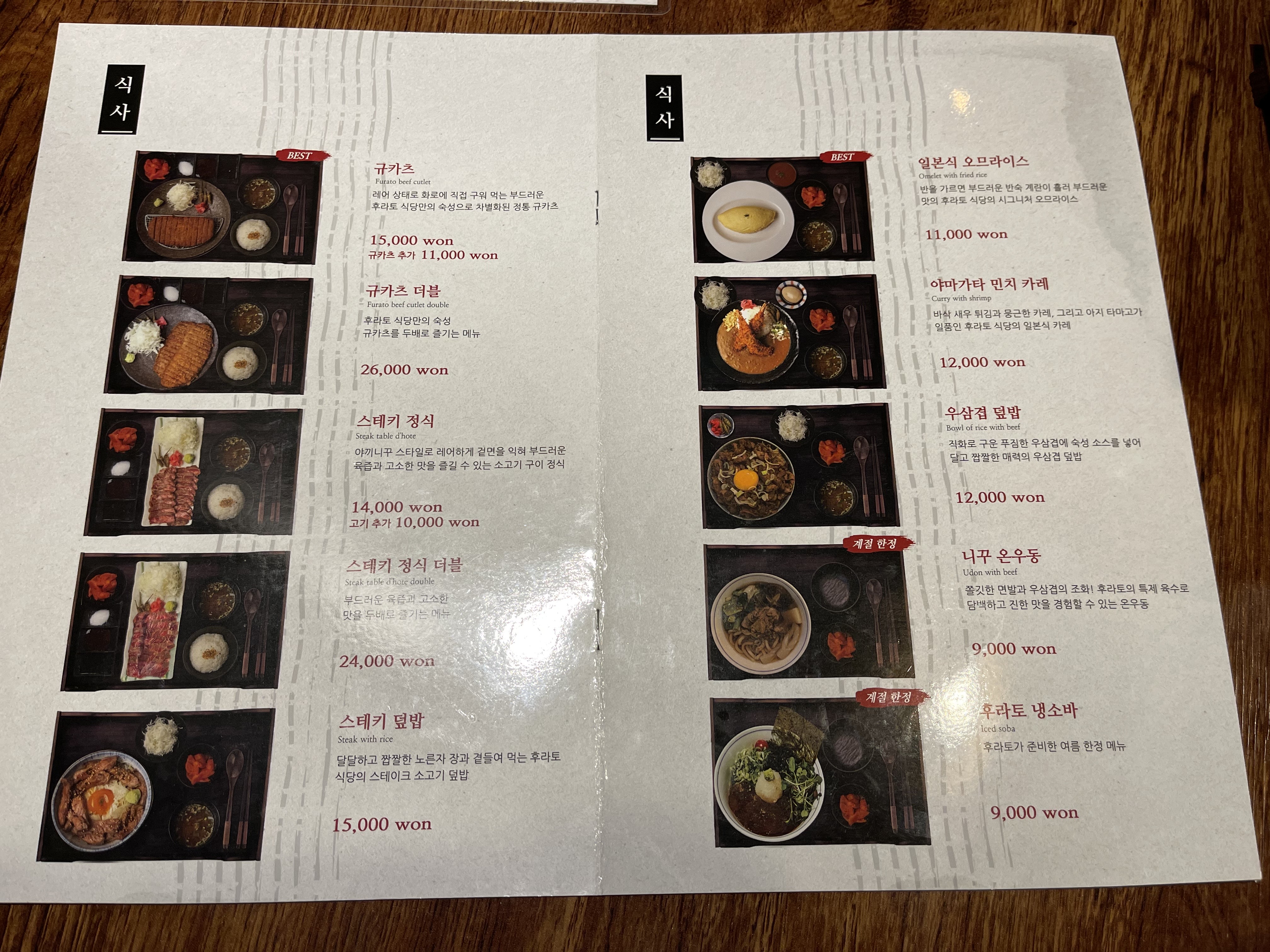 대표적인 메뉴를 볼 수 있는 입간판이 입구에 세워져 있었다. 후라토 규카츠는 신선한 소고기에 튀김옷을 얇게 입혀 고온에서 빠르게 튀겨내어 내어지는 미디움 레어음식이라고 한다. 화로에서 내 기호에 맞게 구워먹기 좋다고 하니, 기대가 된다.