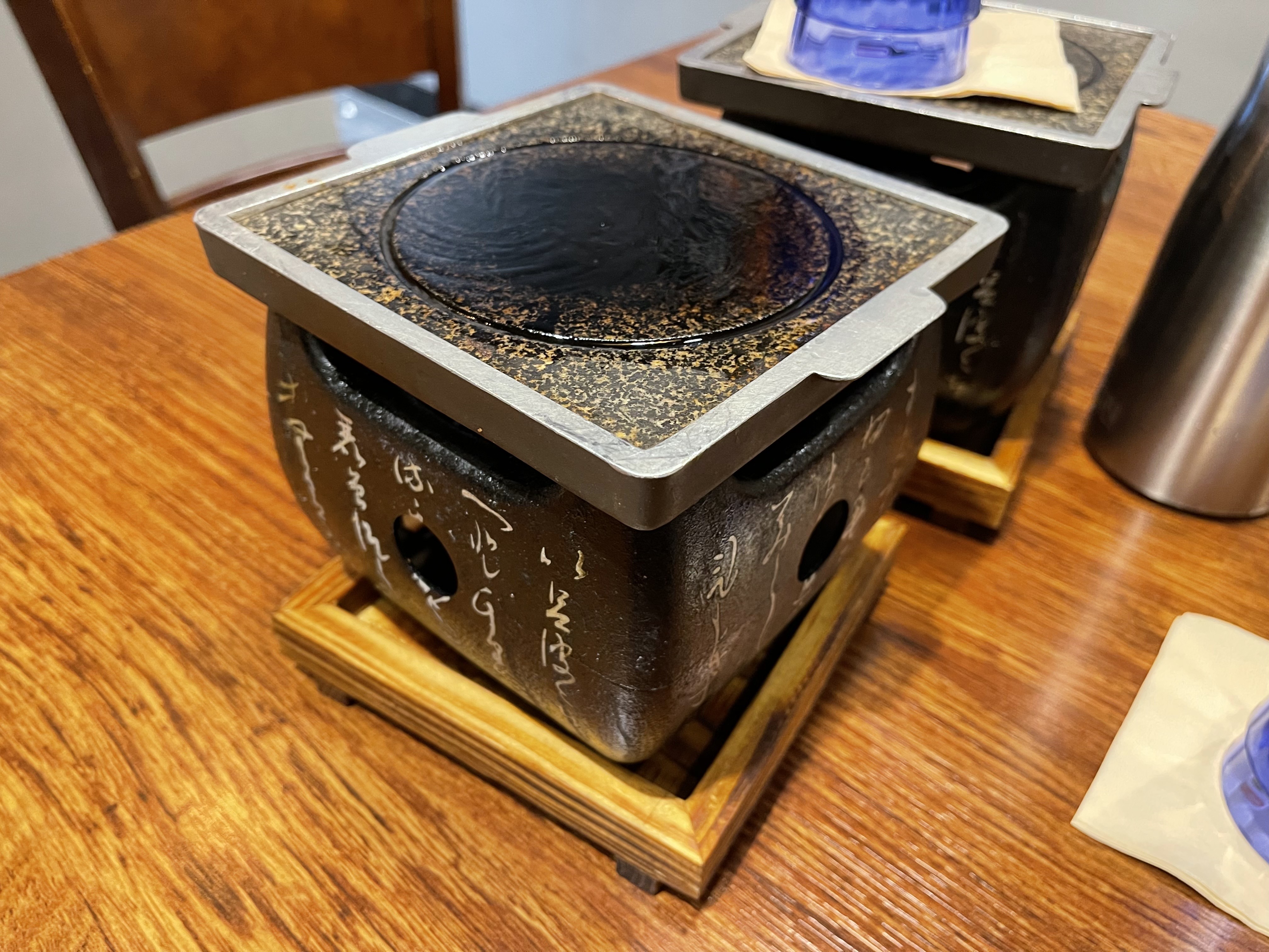 이런 개인 화로가 식탁위에 놓인다. 고체연료로 돌판을 달구는데 돌이 의외로 굉장히 빨리 달아오른다. 납작한 고체연료에 불을 붙여서 돌판위에 고기를 구워먹는 느낌이 좋다.